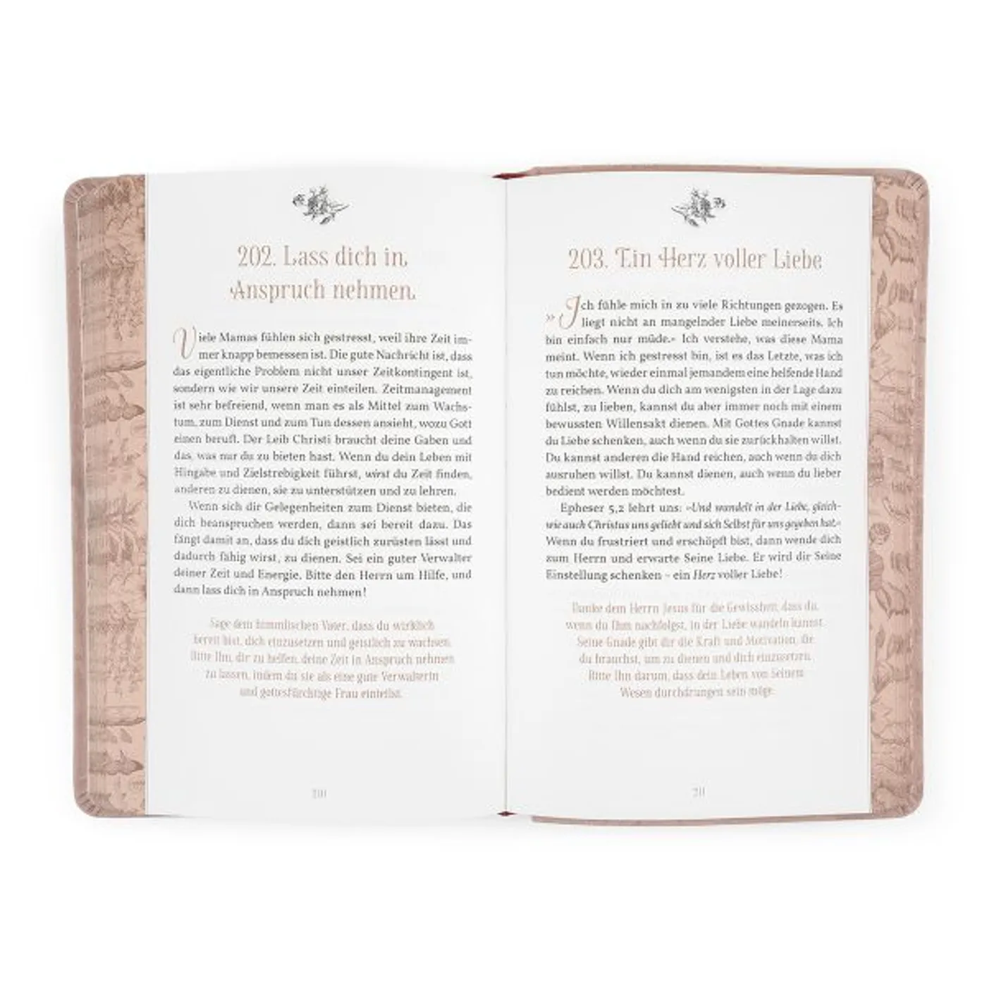 Die Andachten sprechen dabei sehr praxisnah in den Alltag der Mütter hinein. So beschreibt z. B. eine Andacht unter der Überschrift Lass dein Licht leuchten, wie wichtig es ist, das eigene Leben so zu gestalten, dass es Gottes Liebe widerspiegelt. Oder Eine betende Mama zeigt auf, wie entscheidend das Gebet für die Kinder und das eigene Herz ist. Dabei geht es nicht um Perfektion, sondern um Treue, Liebe und das ständige Ausrichten auf Gott.