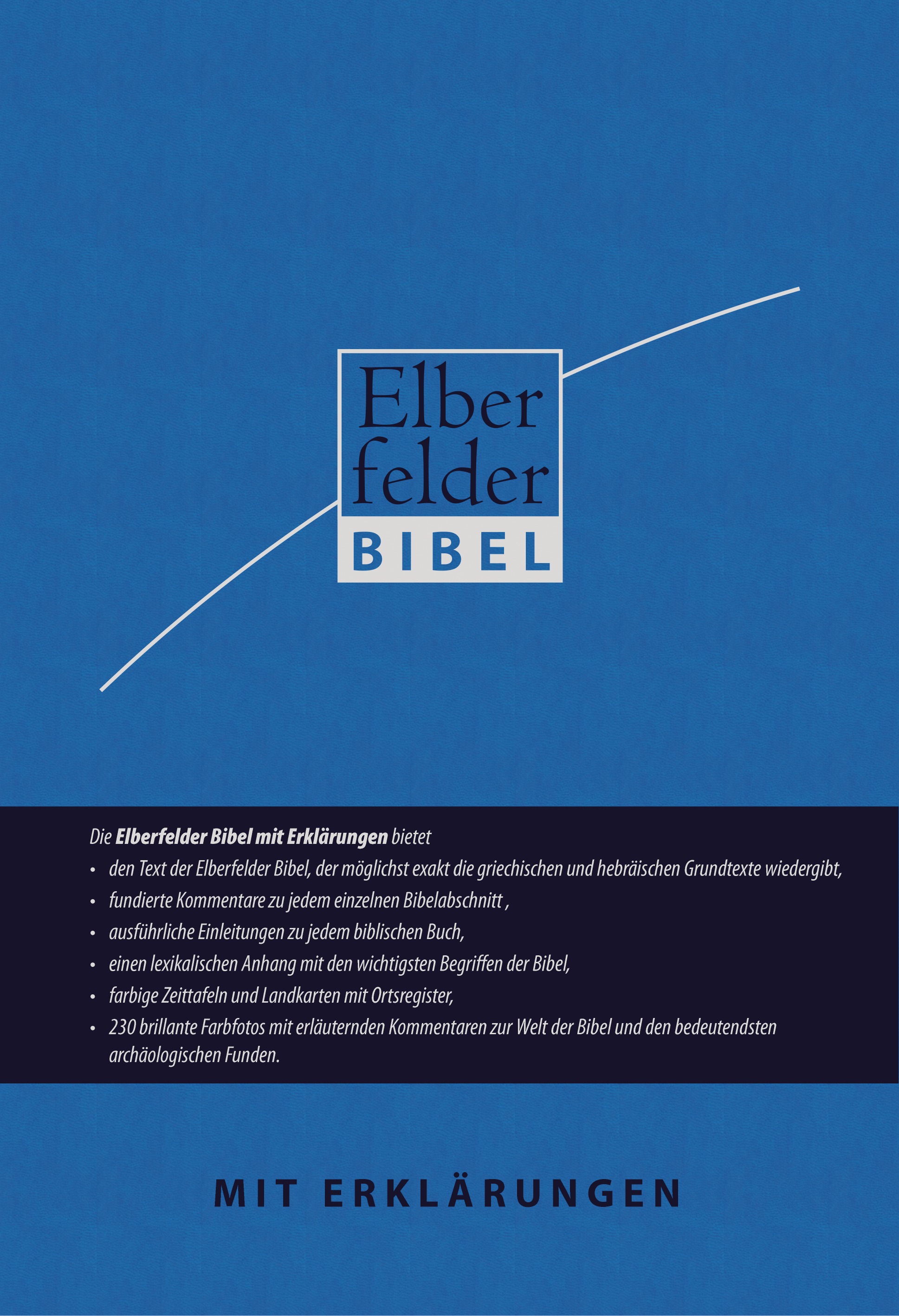 Diese außergewöhnliche Studienbibel enthält den Text der Elberfelder Bibelübersetzung mit zahlreichen Kommentaren, erarbeitet von über 50 namhaften deutschen Theologen. Sie zeigt die wichtigsten exegetischen Erkenntnisse und bietet Bezüge zur Glaubenspraxis. Jedem biblischen Buch geht eine ausführliche Einleitung voran. Diese Studienbibel bietet zudem 80 Farbtafeln mit 245 Fotos von Alexander Schick (Wissenschaftspublizist und Fachmann für alte Bibel- und Handschriftenfunde) zu den wichtigsten biblischen Stätten und archäologischen Funden. Im flexiblen Kunstledereinband mit praktischem Reißverschluss.