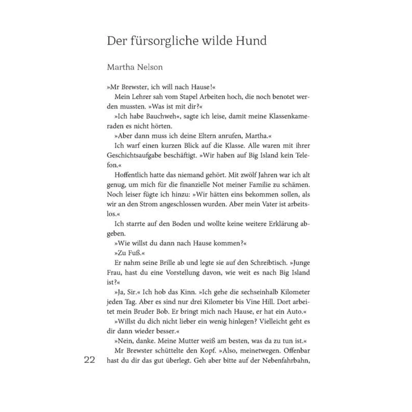 „Selbst ein starker Glaube fragt einen Moment lang ,Warum?', wenn das Undenkbare passiert. Gott antwortet nicht mit dröhnender Stimme hinter prallen Wolken hervor, die von Sonnenstrahlen umkränzt sind. Seine Antworten kommen fast unmerklich, unaufdringlich. Es kann sein, sie stecken im Flüstern des eintönigen Geräuschs von Reifen auf der Straße, wenn man losfährt, um die Beerdigung vorzubereiten. Oder sie erscheinen, wenn man den Stock, die Klammern, die zusätzlichen Medikamente sieht, die nicht mehr gebraucht werden. Oder aber sie sind in den ernsten Blicken zweier Schäferhunde zu finden, die bis zum letzten Atemzug bei der jungen Frau geblieben sind.“