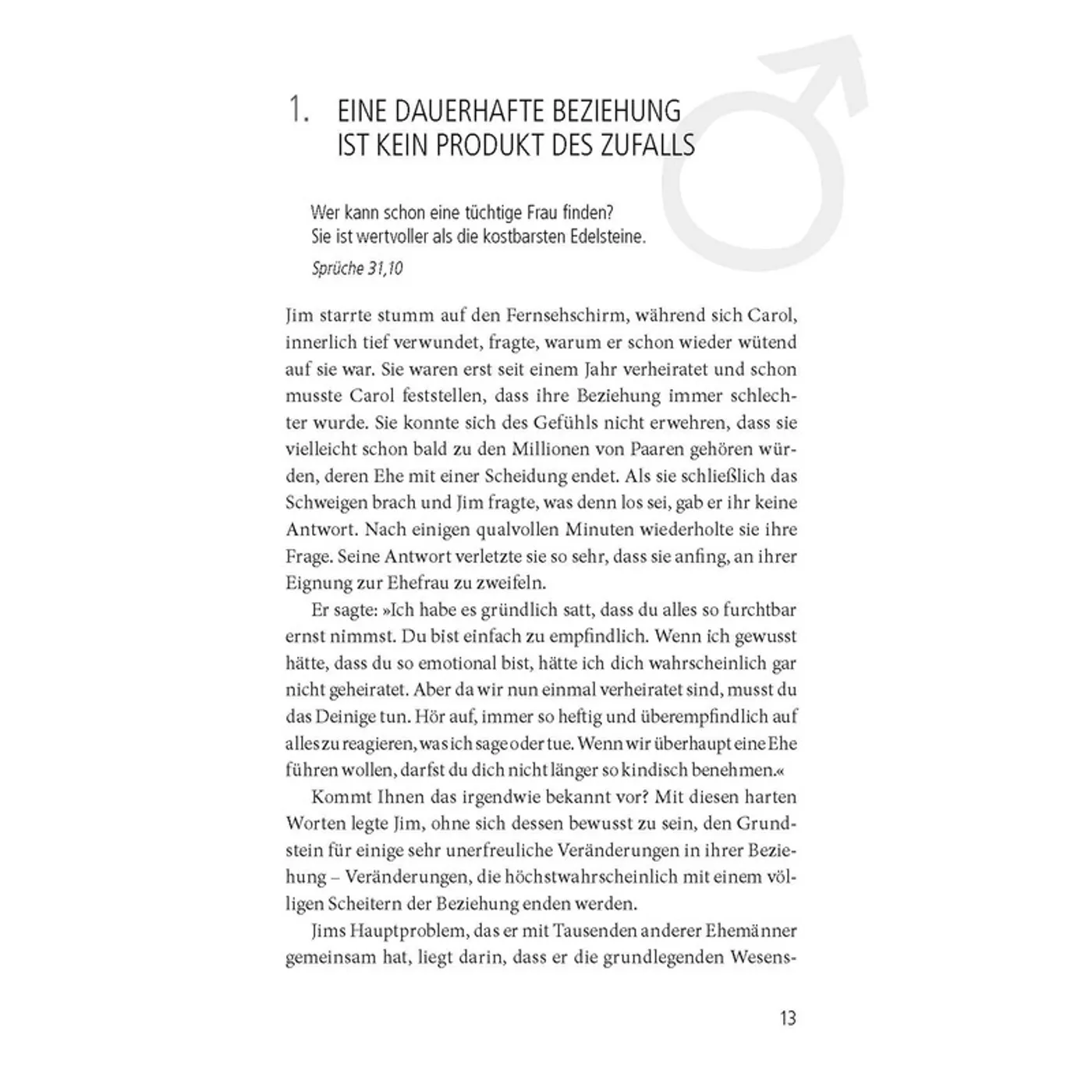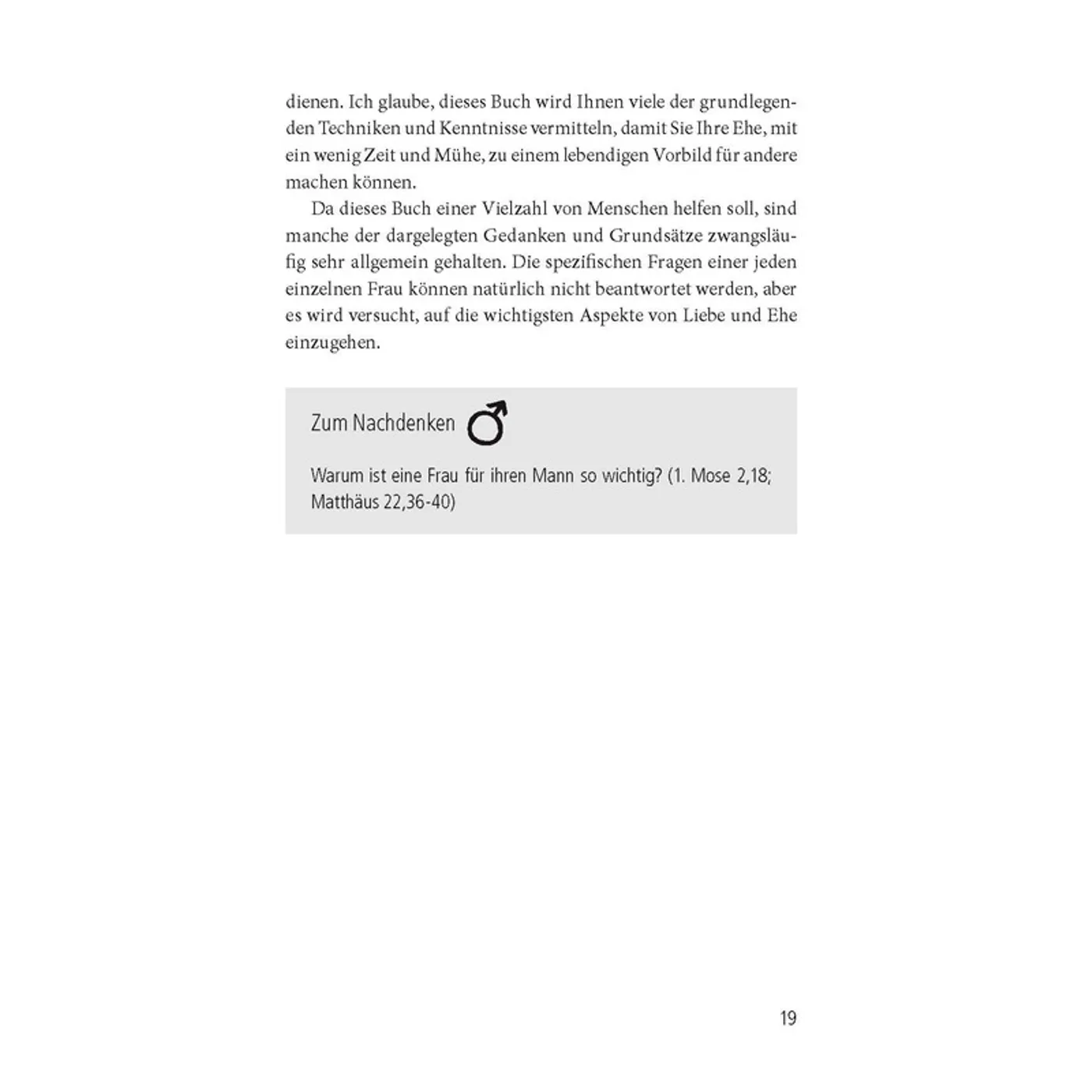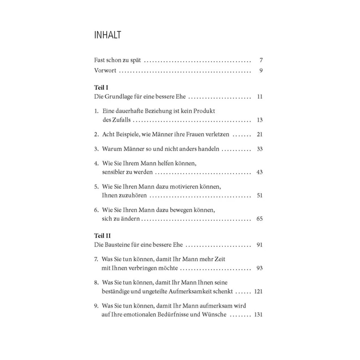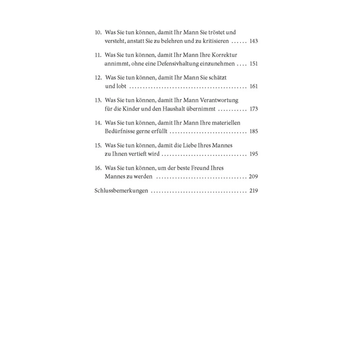 „Dieses Buch möchte Anstöße dazu geben, wie Frauen den Männern helfen können, sodass sie auch zuhören und die Hilfe annehmen. Das Buch soll Frauen zeigen, wie sie ihren Mann zu einer Verbesserung ihrer Beziehung motivieren können. Es soll viele der grundlegenden Techniken und Kenntnisse vermitteln, damit man seine eigene Ehe mit ein wenig Zeit und Mühe zu einem lebendigen Vorbild für andere machen kann. Ziel dieses Buches ist es auch, zu zeigen, wie man seine Ehe gestalten und festigen, sie mit echter, dauerhafter Liebe erfüllen kann. Eines der wichtigsten Ziele dieses Buches ist, zu helfen, der beste Freund seines Ehemannes zu werden.“
