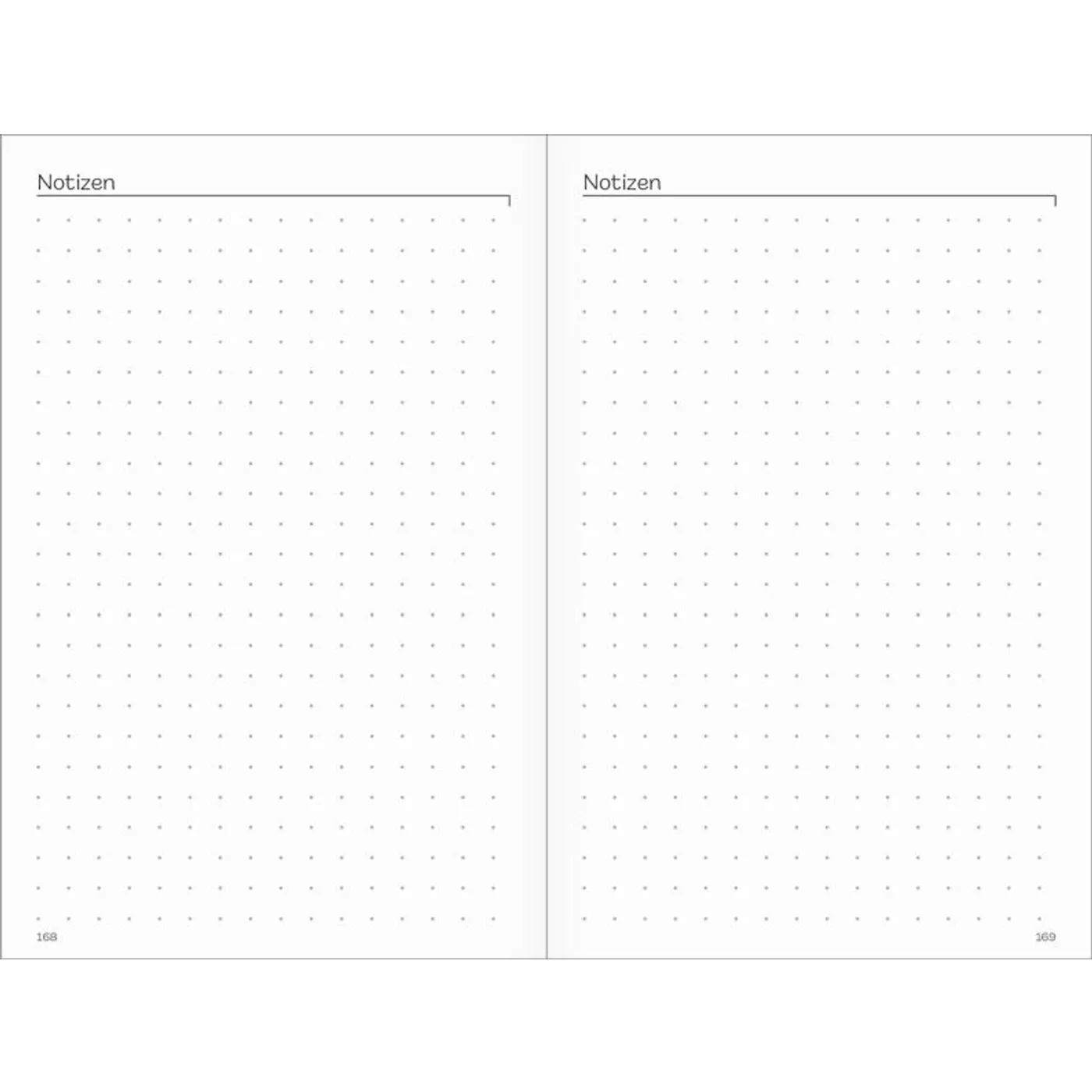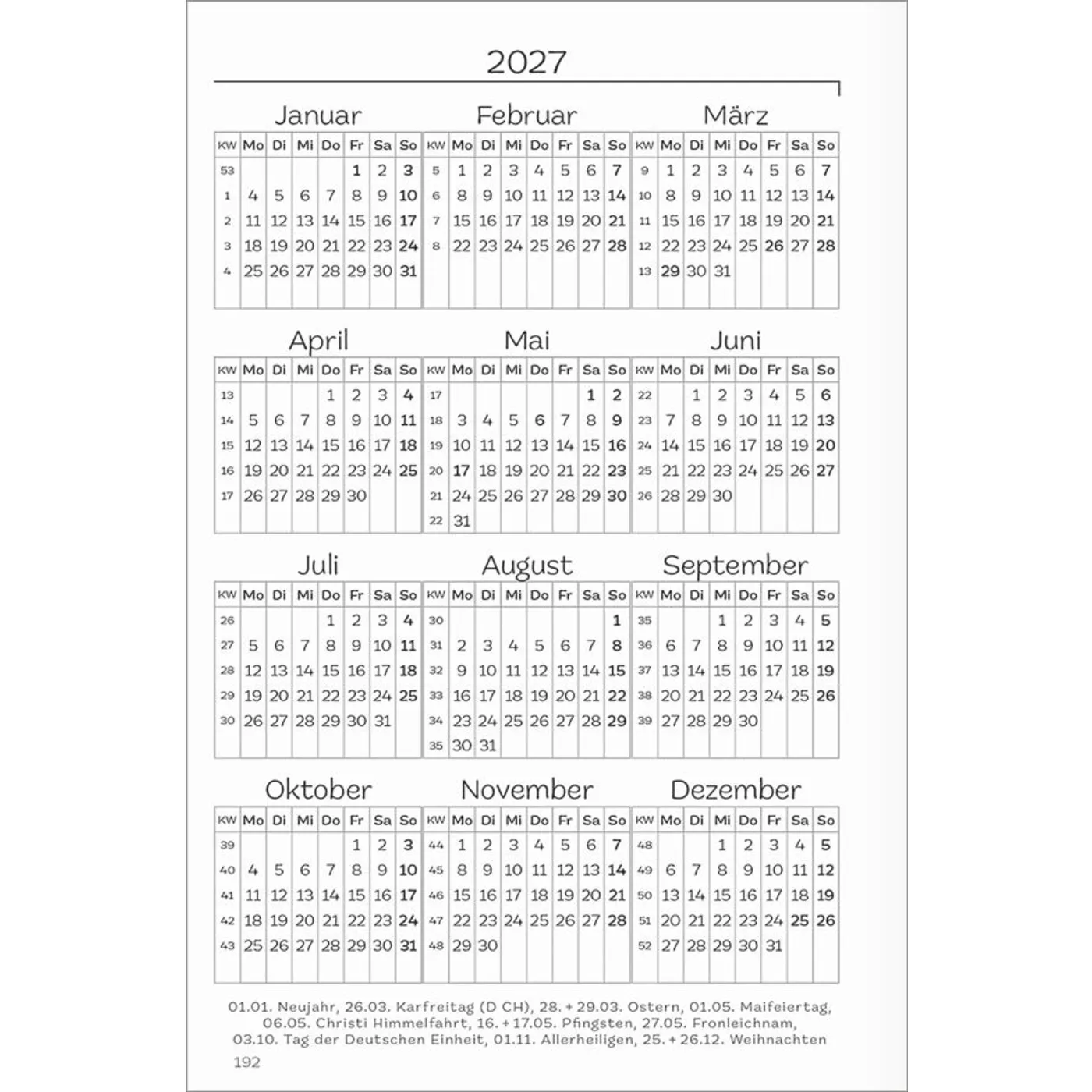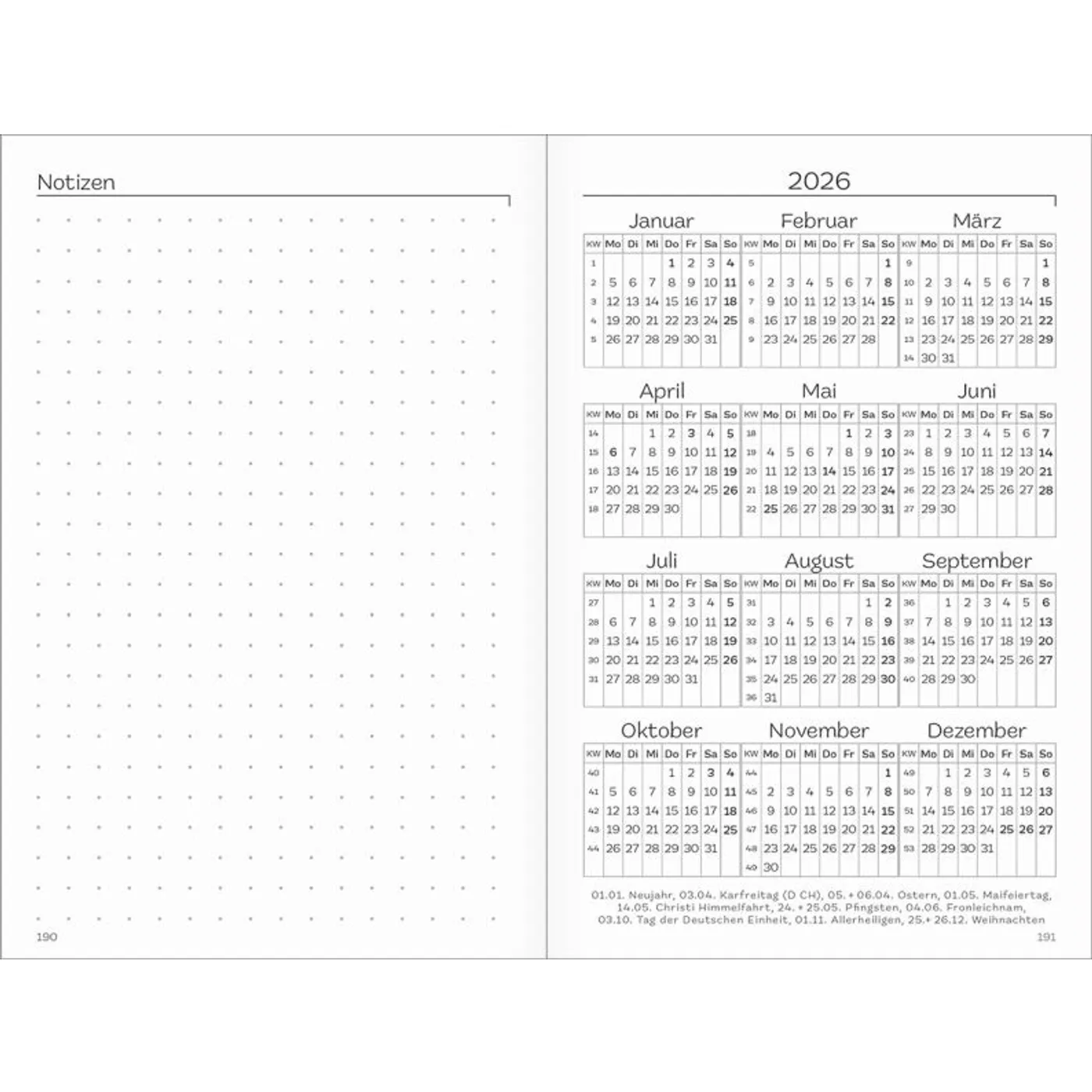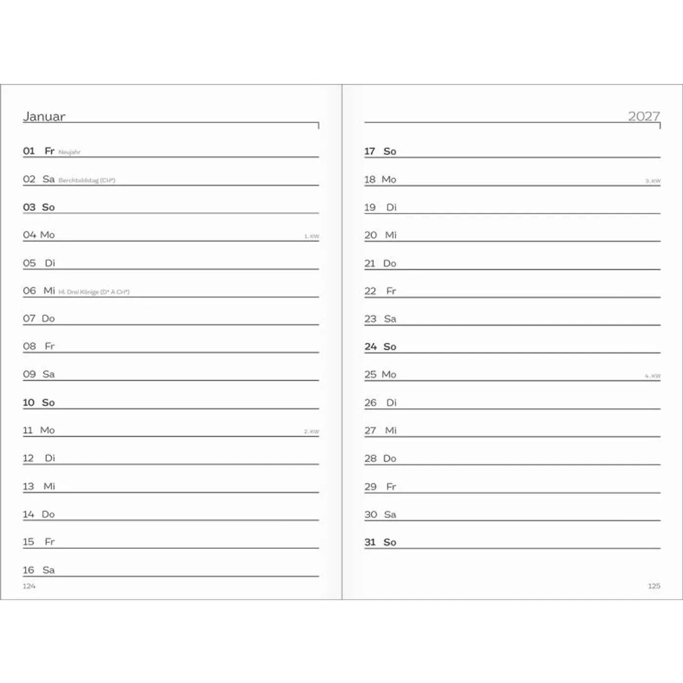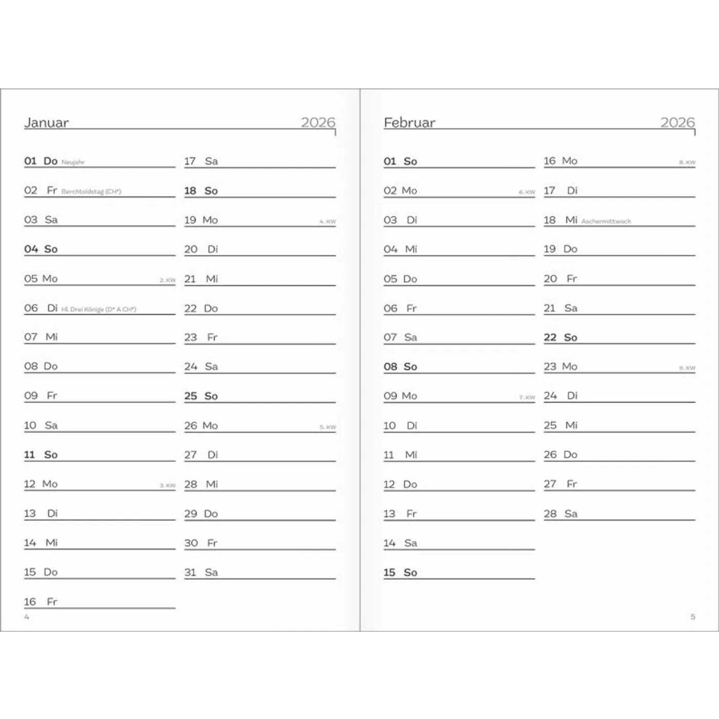 Eine Doppelseite pro Woche, mit Lesebändchen und Gummiverschluss