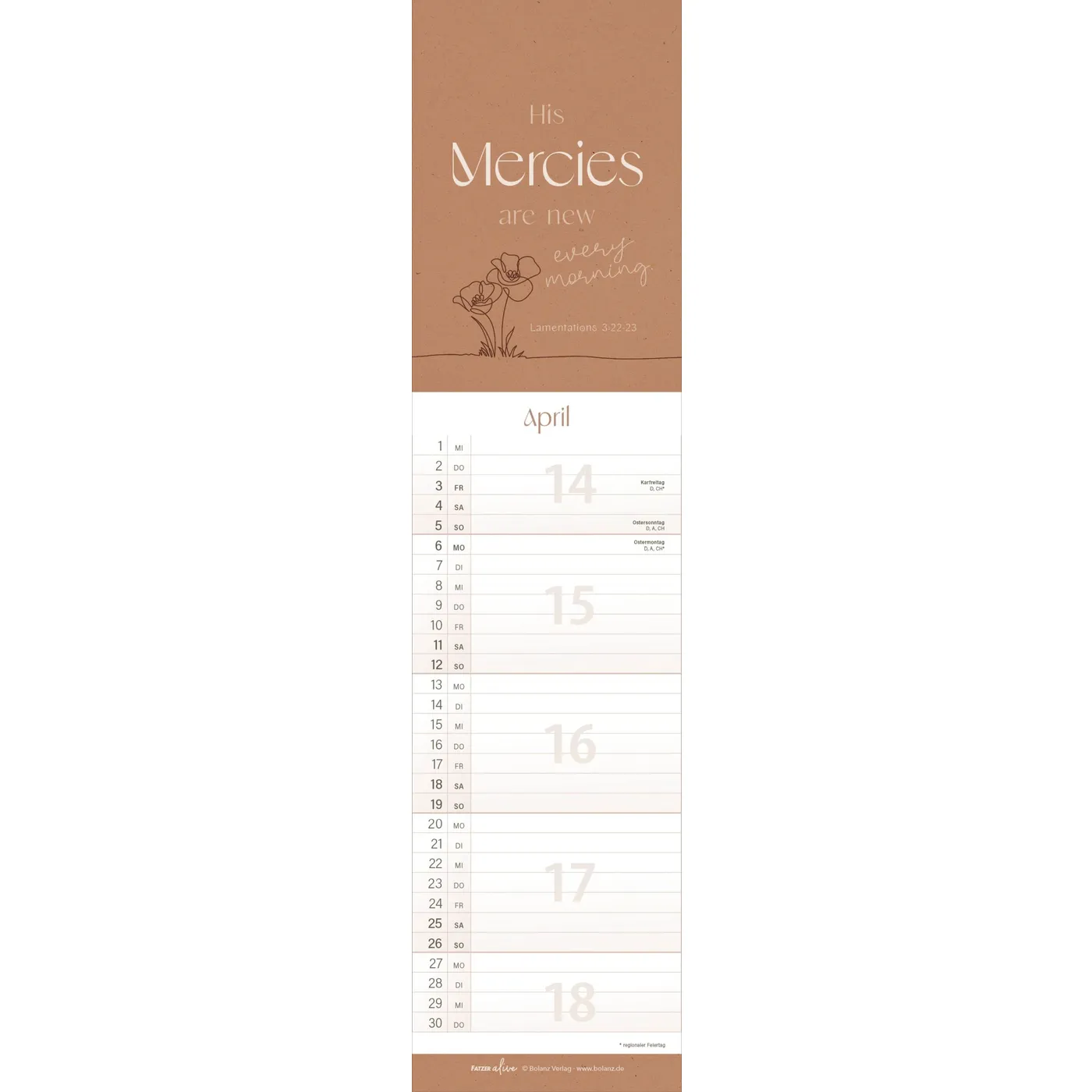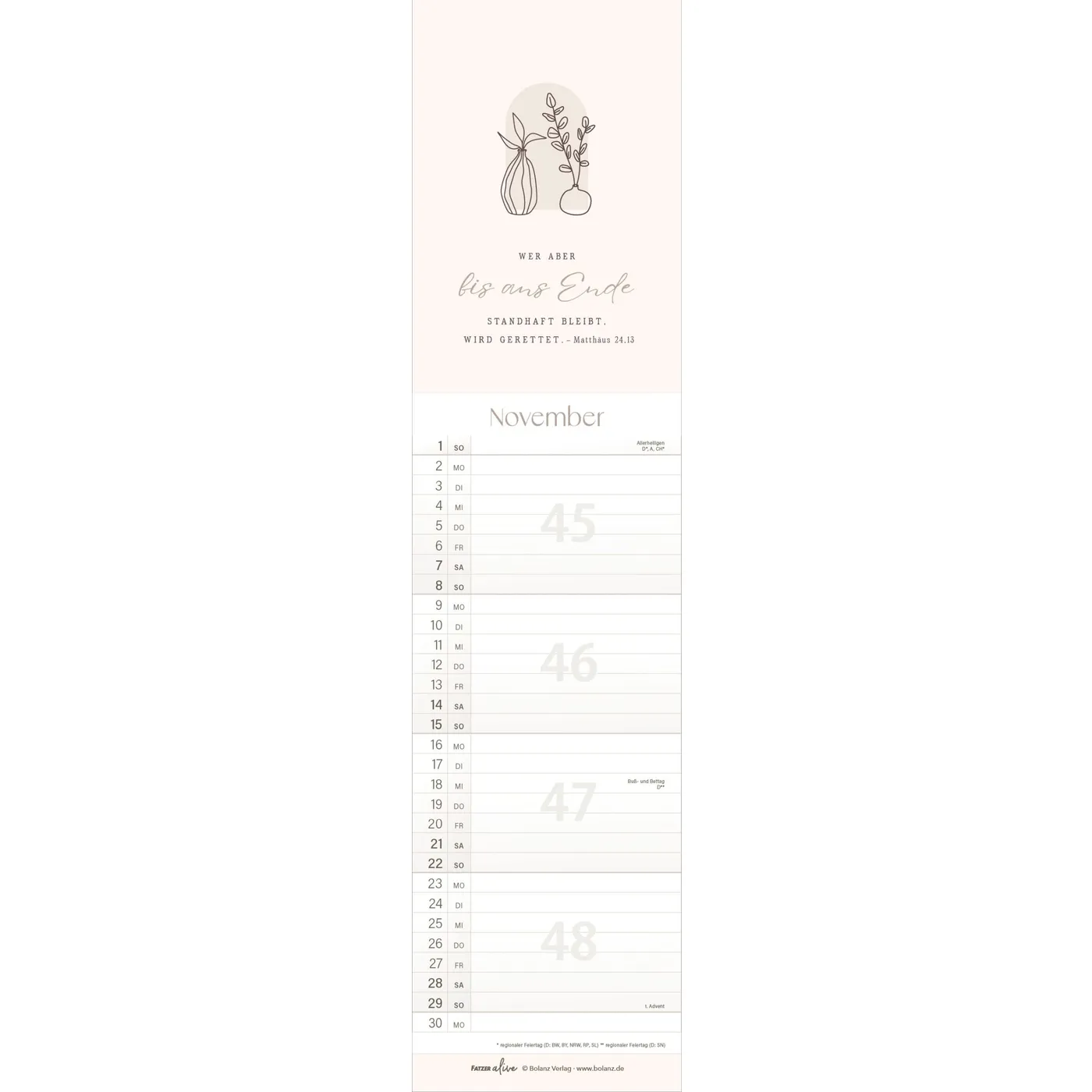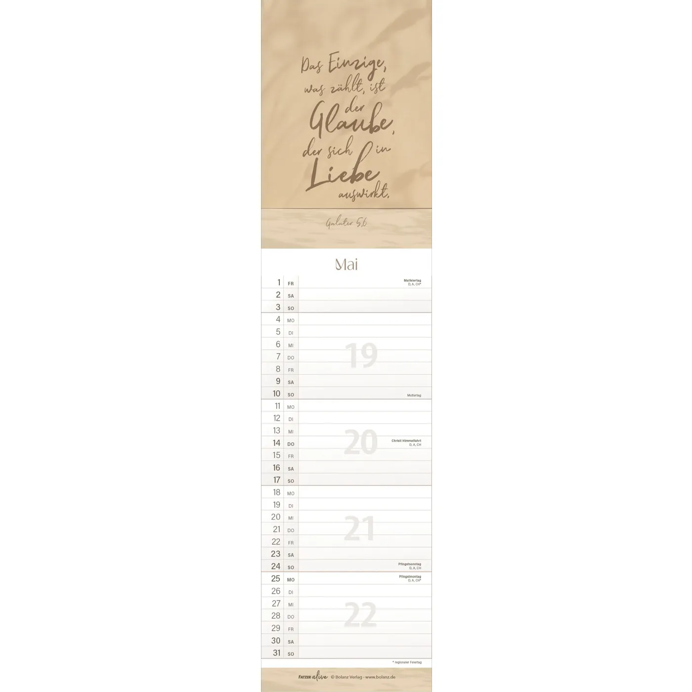 Jedes der 12 schlanken Monatsblätter aus der Fatzer alive Reihe inspiriert mit einem eigenen, mit Liebe zum Detail gestalteten Bibelvers. Inklusive Ferienkalender.