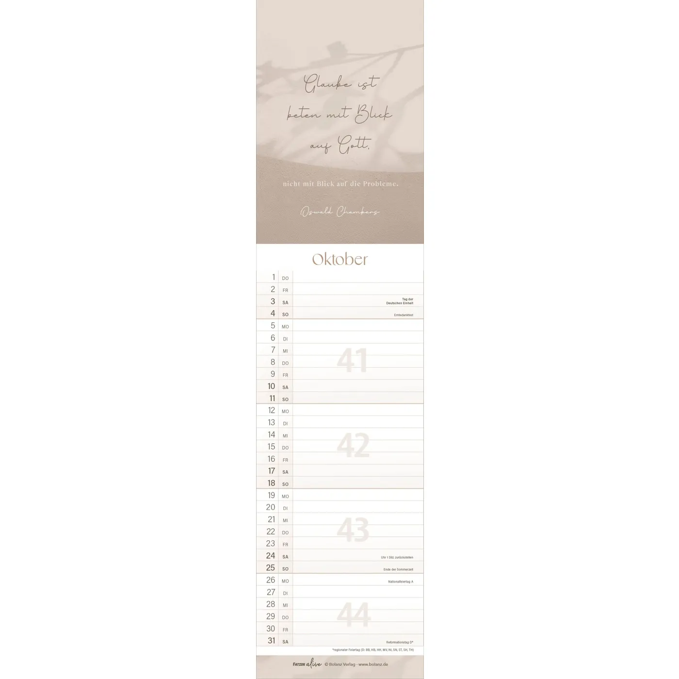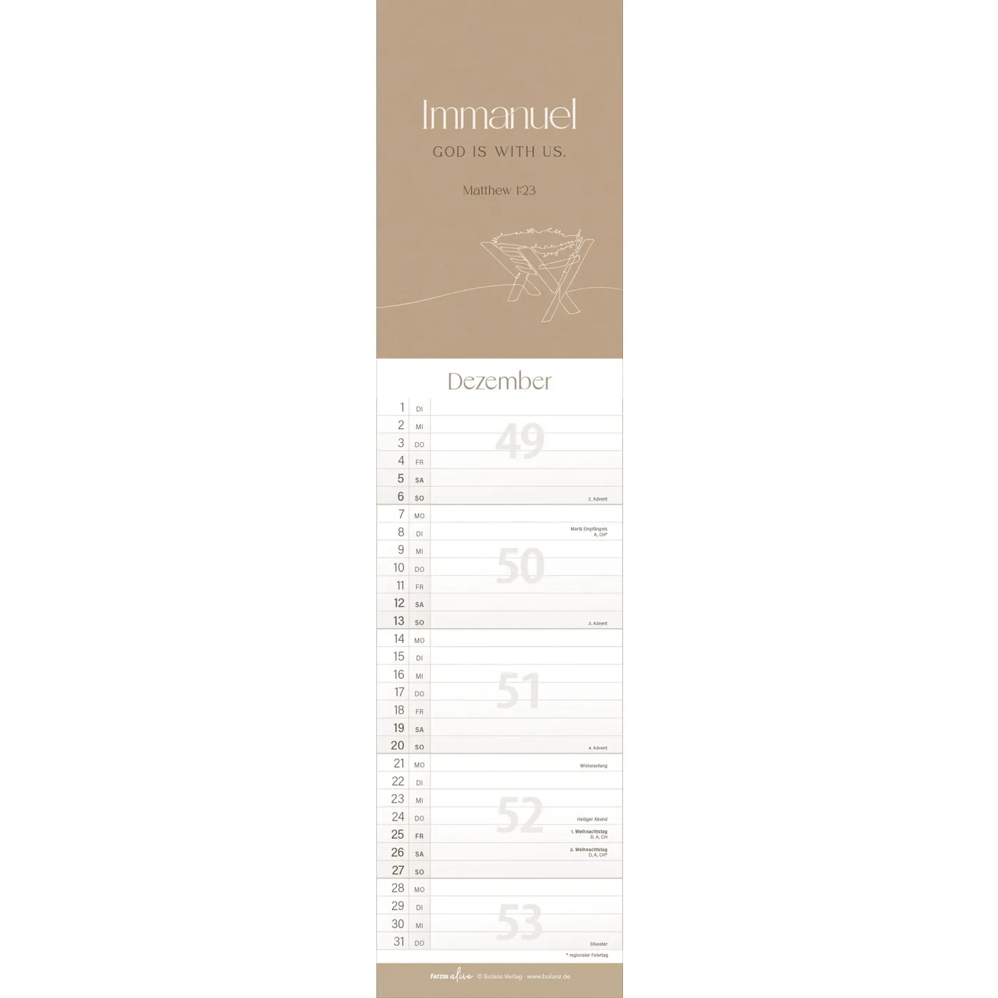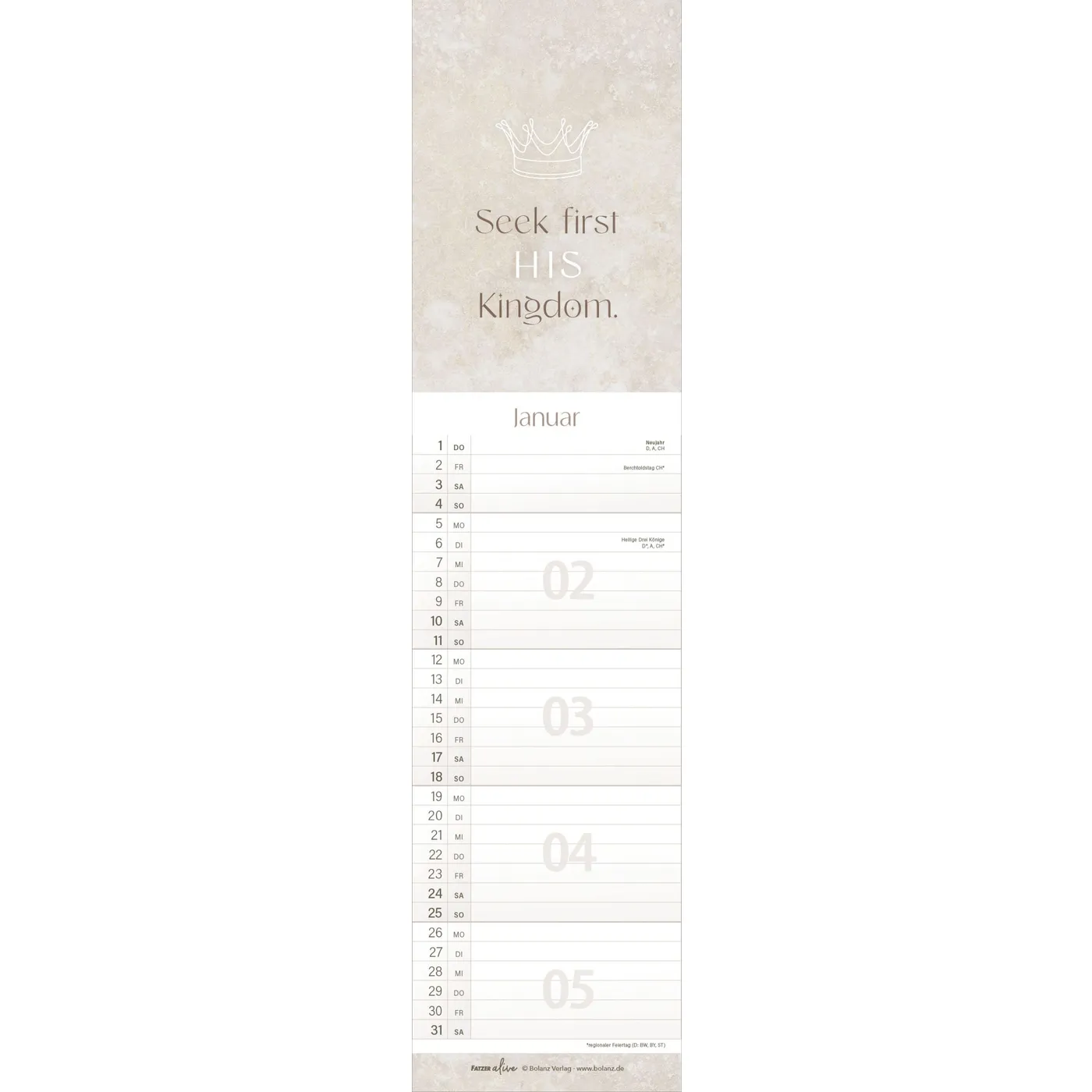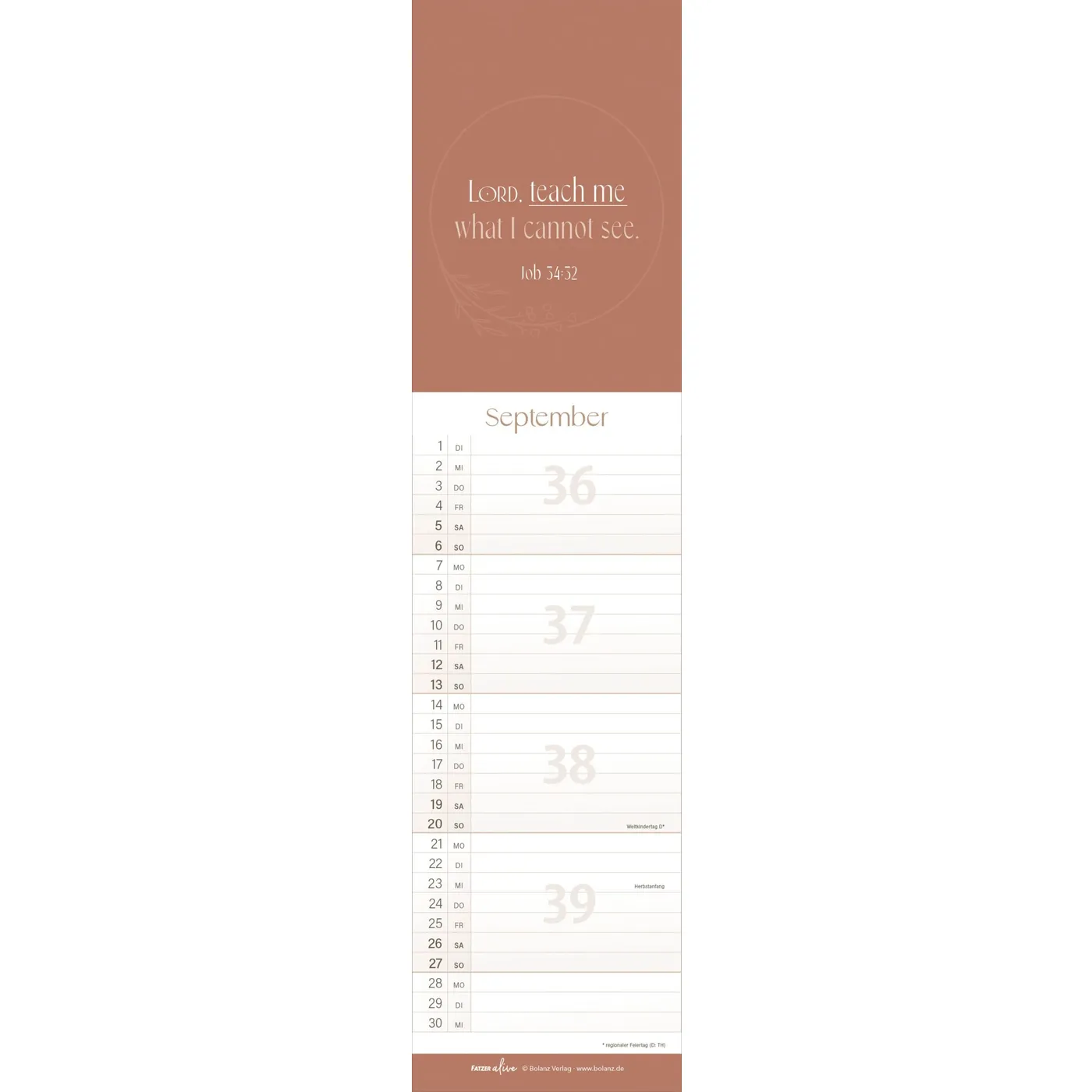 Jedes der 12 schlanken Monatsblätter aus der Fatzer alive Reihe inspiriert mit einem eigenen, mit Liebe zum Detail gestalteten Bibelvers. Inklusive Ferienkalender.