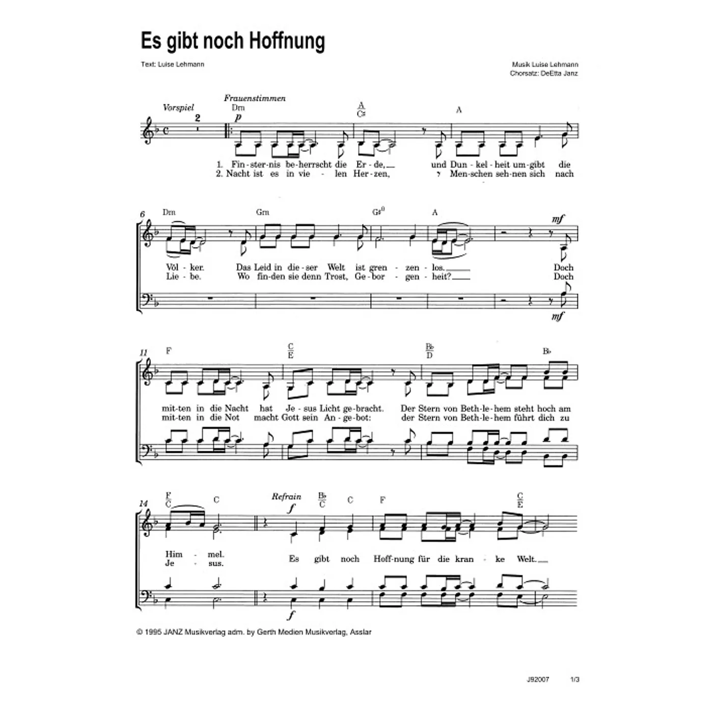 Es gibt noch Hoffnung (diese Variante haben Sie gerade ausgewählt) (modern, gemischter Chor, mit Akkorden, vierstimmig, D-Moll) Luise Lehmann (Komposition, Text), DeEtta Janz (Chorsatz) |