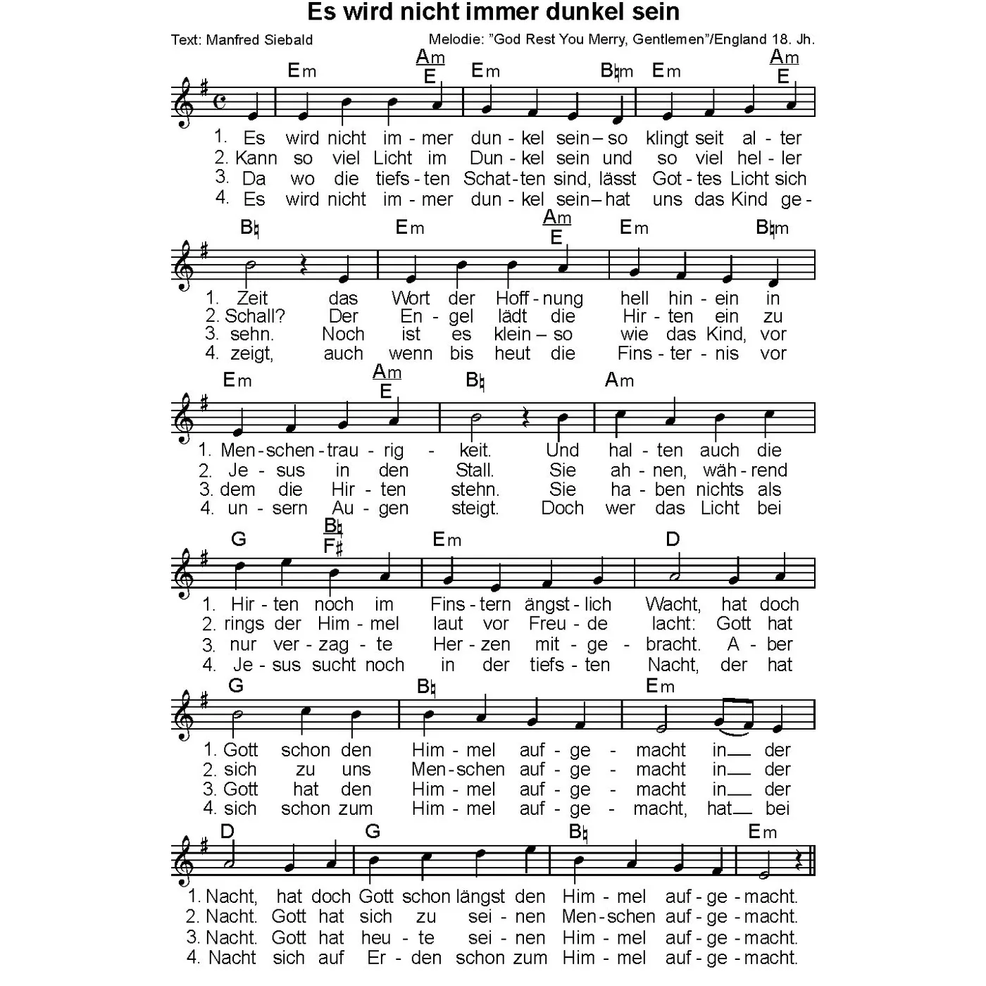 Es wird nicht immer dunkel sein (diese Variante haben Sie gerade ausgewählt) (Neuere Gemeindelieder, einstimmig, E-Moll, Allegro (134), Viertel) England 18. Jh. (Melodie), Manfred Siebald (Text) |
