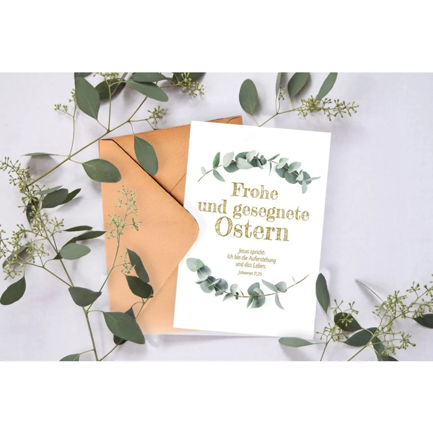 Versende liebevolle Ostergrüße mit dieser stilvoll gestalteten Faltkarte aus dem Bolanz Verlag. Das dezente Motiv zeigt schlichte Eukalyptus-Zweige, die durch ihre klare Eleganz Hoffnung und neues Leben symbolisieren. Der Text „Frohe und gesegnete Ostern“ wird durch den Bibelvers aus Johannes 11,25 ergänzt: „Jesus spricht: Ich bin die Auferstehung und das Leben.“