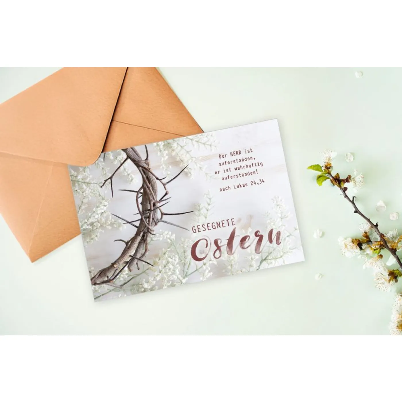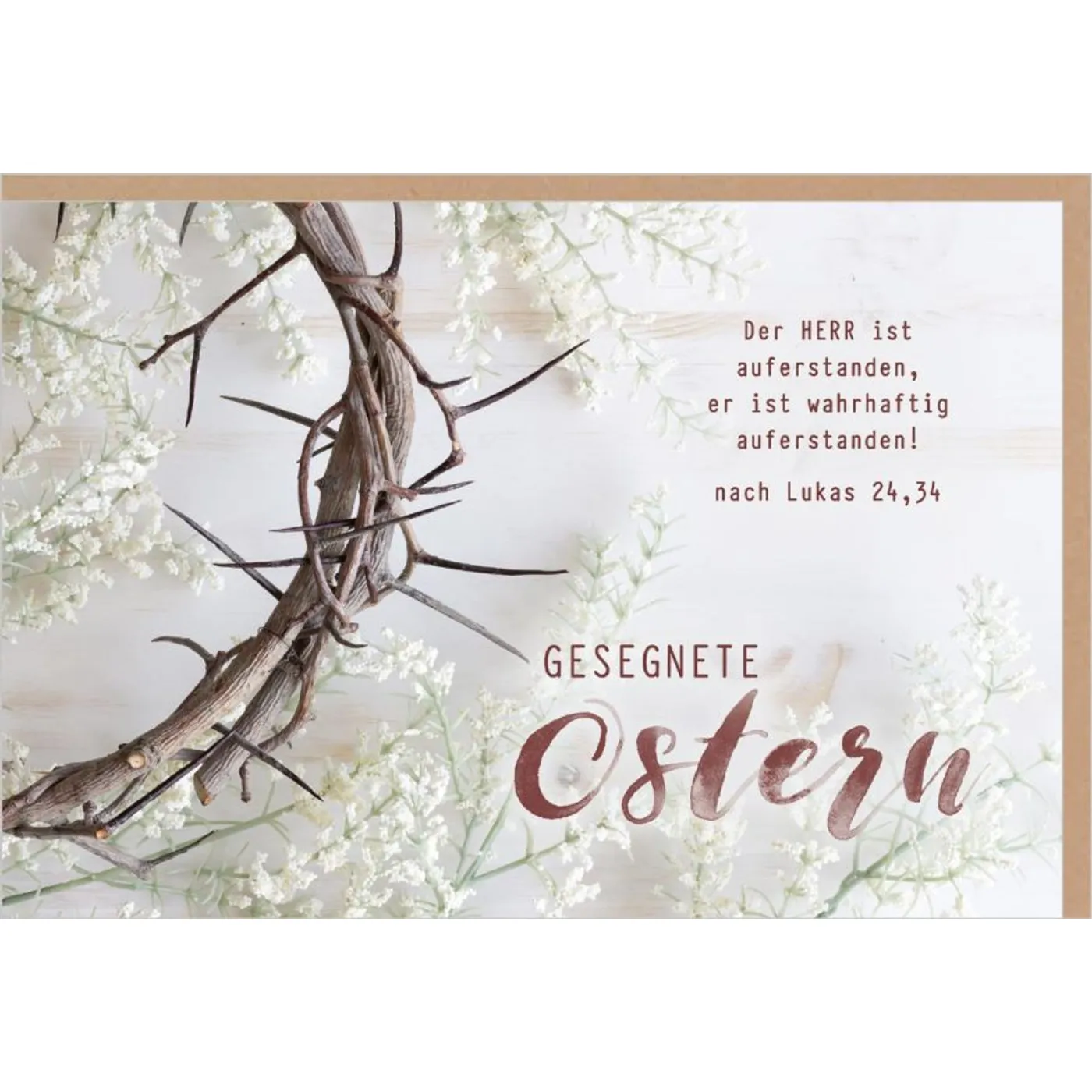 Das Motiv zeigt eine Dornenkrone, umgeben von zarten, hellen Blütenzweigen. Dieses starke Bild vereint das Leid und die Überwindung des Todes mit der Gnade und dem neuen Leben, das Gott schenkt.
