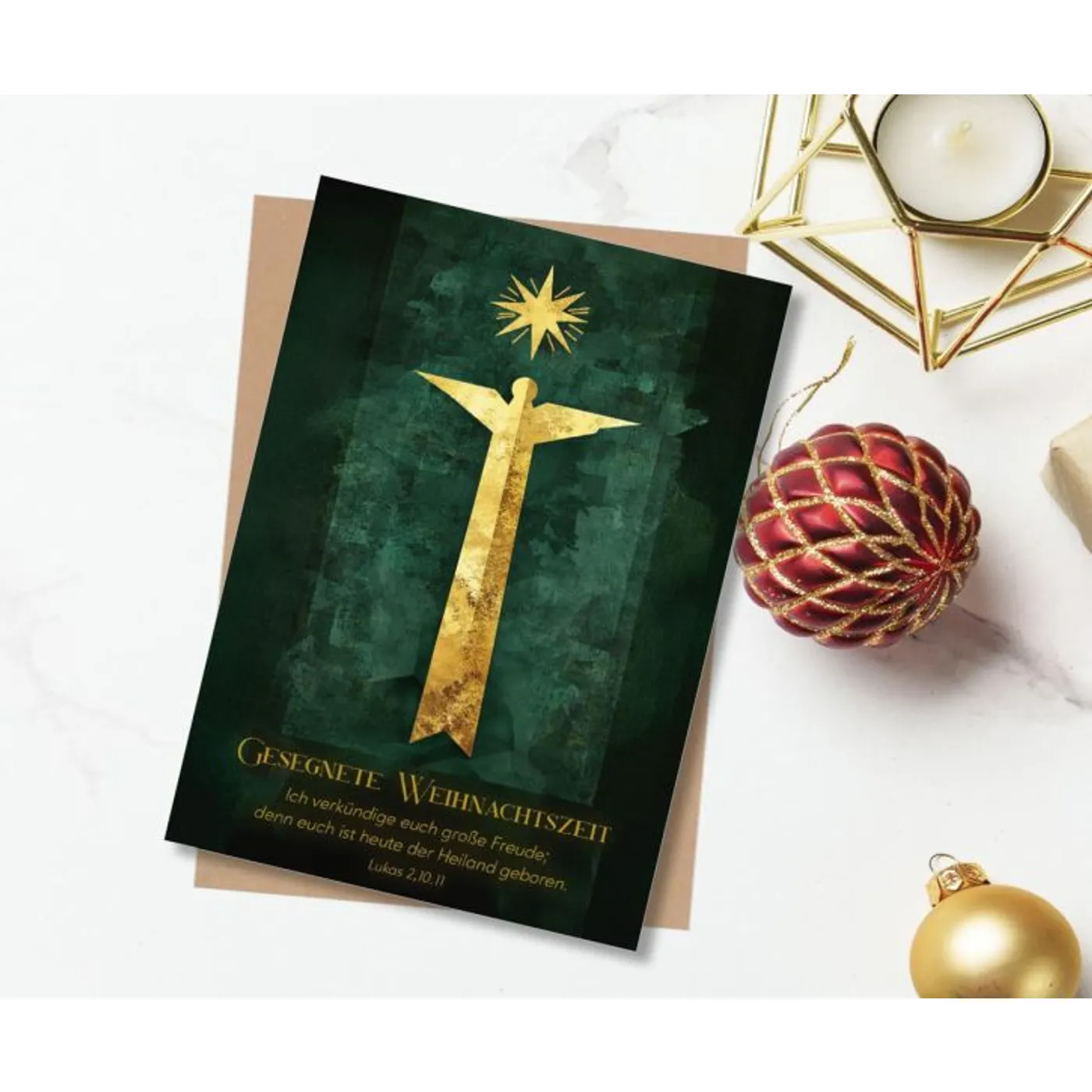 Diese hochwertig verarbeitete Faltkarte im Hochformat (12 x 17 cm) verbindet modernes Design mit einer klaren weihnachtlichen Botschaft. Der smaragdgrüne Hintergrund sorgt für eine ruhige, edle Atmosphäre und bildet die Bühne für eine stilisierte Darstellung eines Engels, über dem ein leuchtender Stern steht. Dieses dezente Motiv bringt auf ästhetische Weise den Kern des Weihnachtsgeschehens zum Ausdruck.
