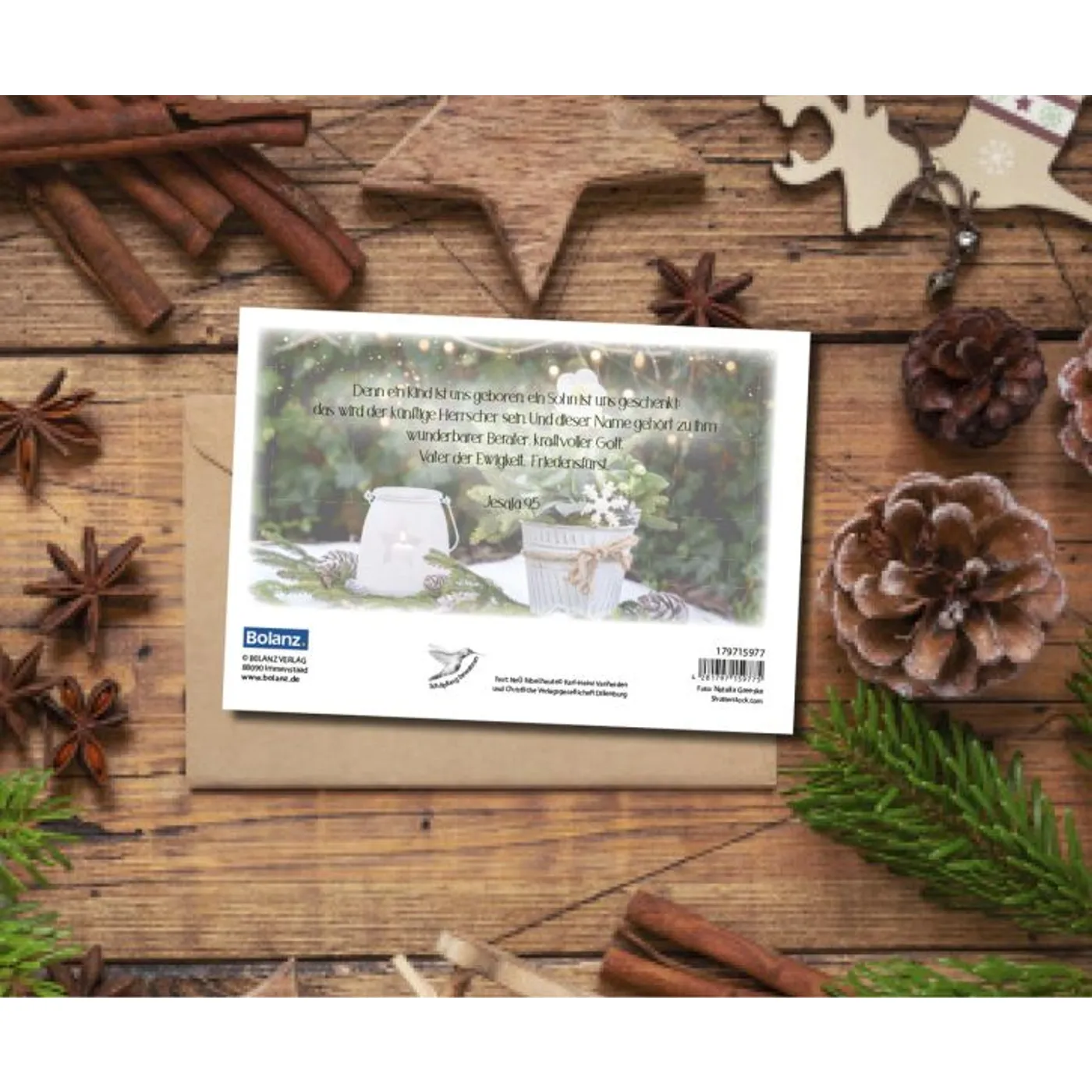 Auf der Rückseite steht ein kraftvoller und bedeutungsvoller Bibelvers aus Jesaja 9,5: „Denn ein Kind ist uns geboren, ein Sohn ist uns geschenkt; das wird der künftige Herrscher sein. Und dieser Name gehört zu ihm: wunderbarer Berater, kraftvoller Gott, Vater der Ewigkeit, Friedensfürst.“