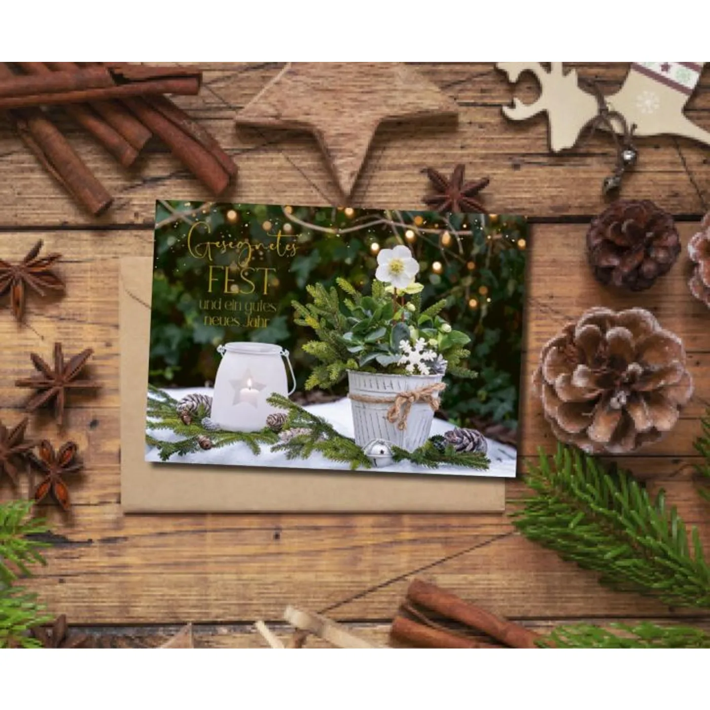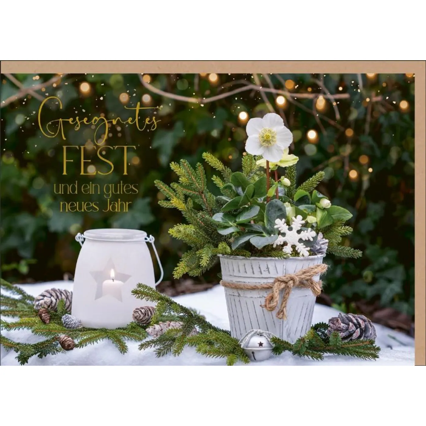 Diese festliche Weihnachtskarte im Querformat bringt Wärme, Hoffnung und eine stille Freude in die Advents- und Weihnachtszeit. Mit stimmungsvollen Details wie einer leuchtenden Kerze in einem eleganten Windlicht, einem dekorativen Pflanztopf und umrahmendem Tannengrün schafft sie eine besinnliche Atmosphäre – ideal, um persönliche Weihnachtsgrüße zu übermitteln.