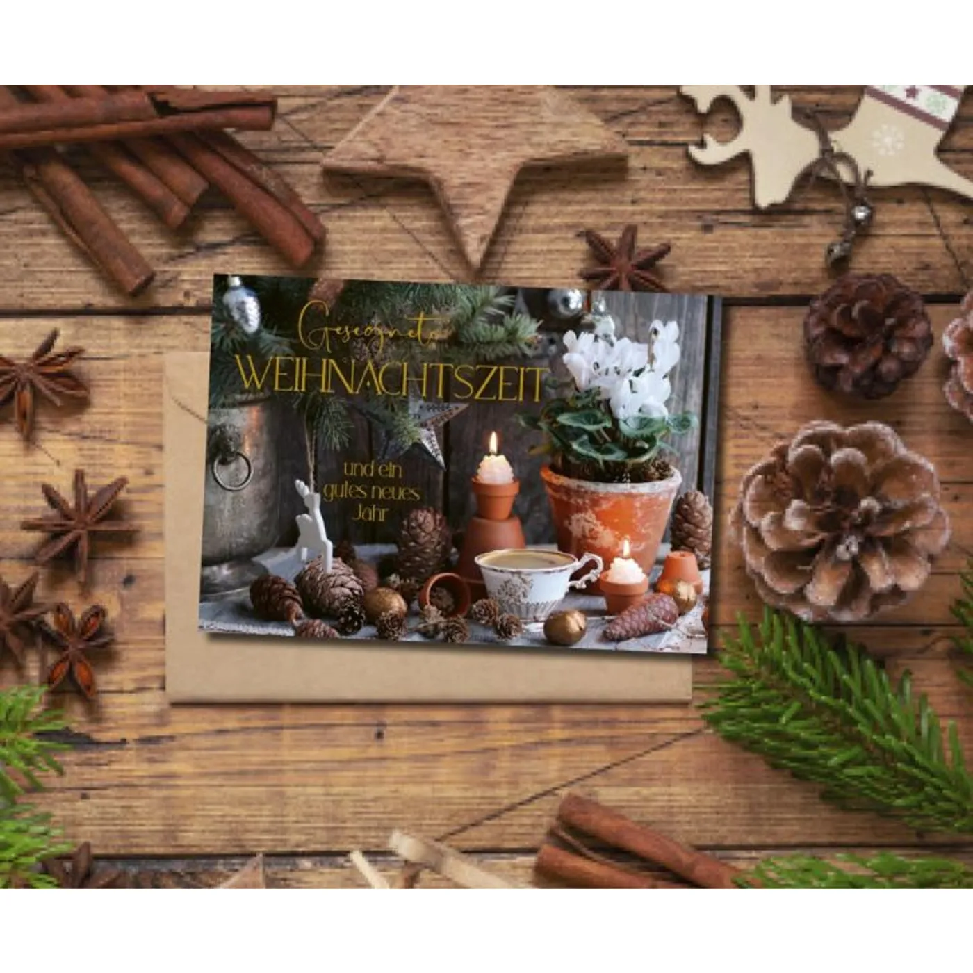 Diese hochwertige Weihnachtskarte im Querformat bringt Wärme, Stil und eine tiefgründige Botschaft auf wunderbare Weise zusammen. Das detailreiche Motiv zeigt eine liebevoll gestaltete Gartenszene: Auf einem Tisch sind Tannenzapfen, Kerzen, winterliche Zweige und grüne Pflanzen harmonisch arrangiert – ein festlicher Stillleben-Moment, der Ruhe und Geborgenheit ausstrahlt. Die edle Goldveredelung verleiht dem Motiv zusätzlich eine elegante, feierliche Note.