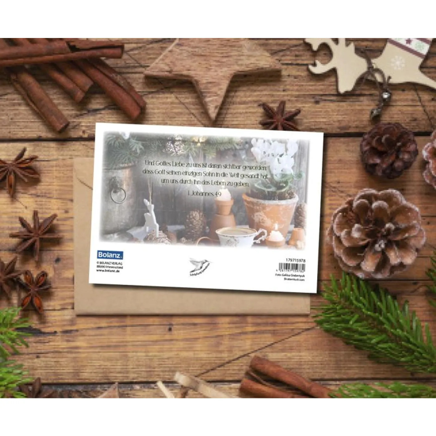 Auf der Rückseite findet sich der bewegende Bibelvers aus 1. Johannes 4,9: „Und Gottes Liebe zu uns ist daran sichtbar geworden, dass Gott seinen einzigen Sohn in die Welt gesandt hat, um uns durch ihn das Leben zu geben.“