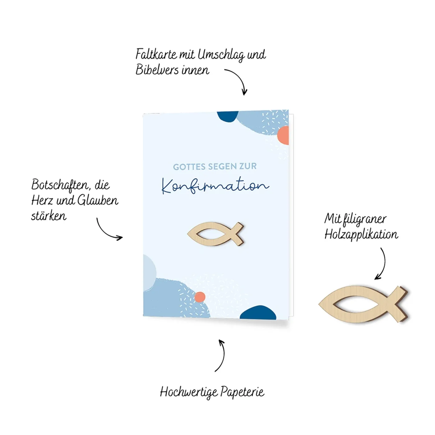 Segen, der von Herzen kommt: Diese liebevoll gestalteten Faltkarten verbinden hochwertige Papeterie mit einer besonderen Symbolkraft: Eine filigrane Holzapplikation und christliche Worte der Ermutigung machen jede Karte zu einem besonderen Geschenk mit bleibendem Wert - Botschaften, die Herz und Glauben stärken.