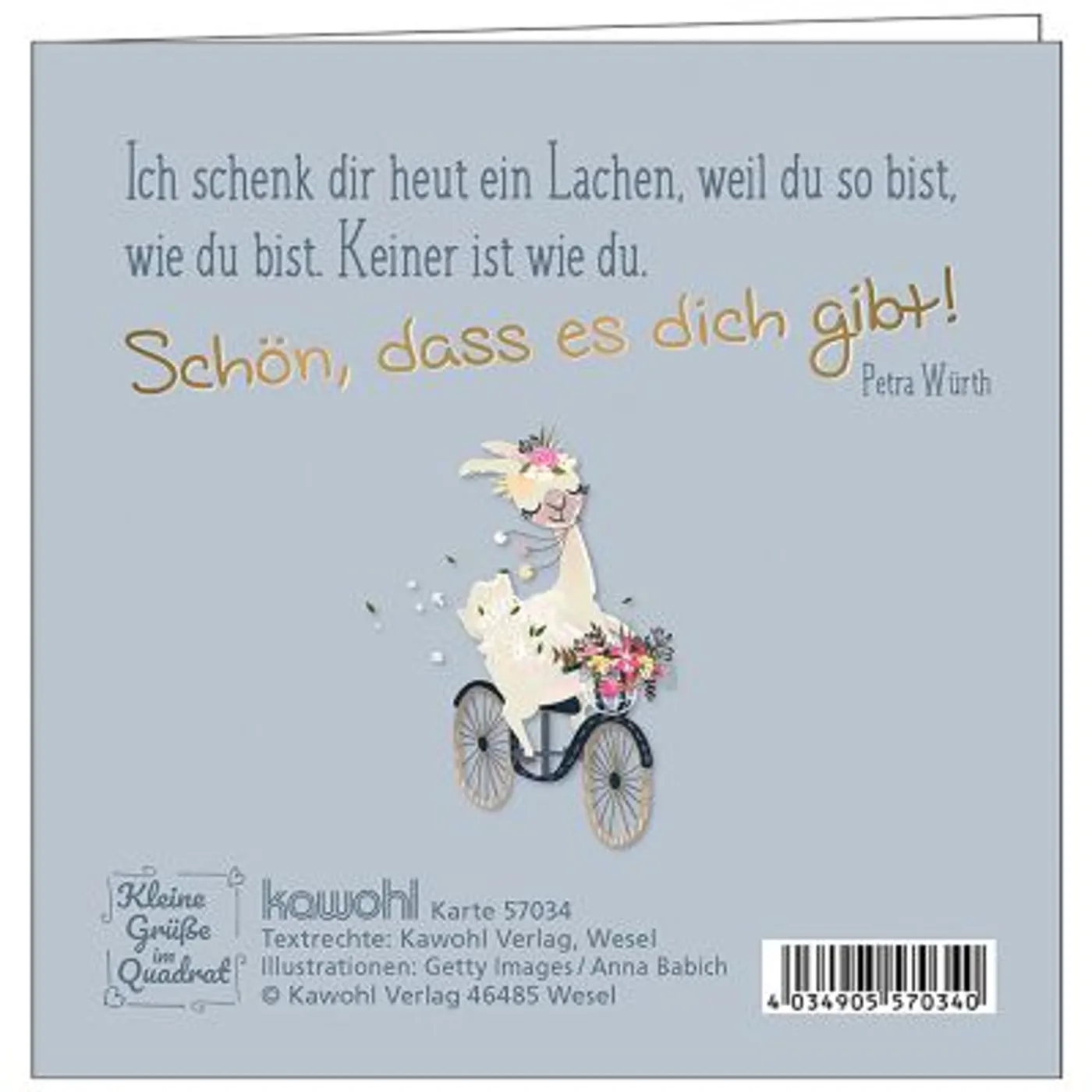 Text auf der Rückseite: Ich schenk dir heut ein Lachen, weil du so bist, wie du bist. Keiner ist wie du. Schön, dass es dich gibt. Petra Würth