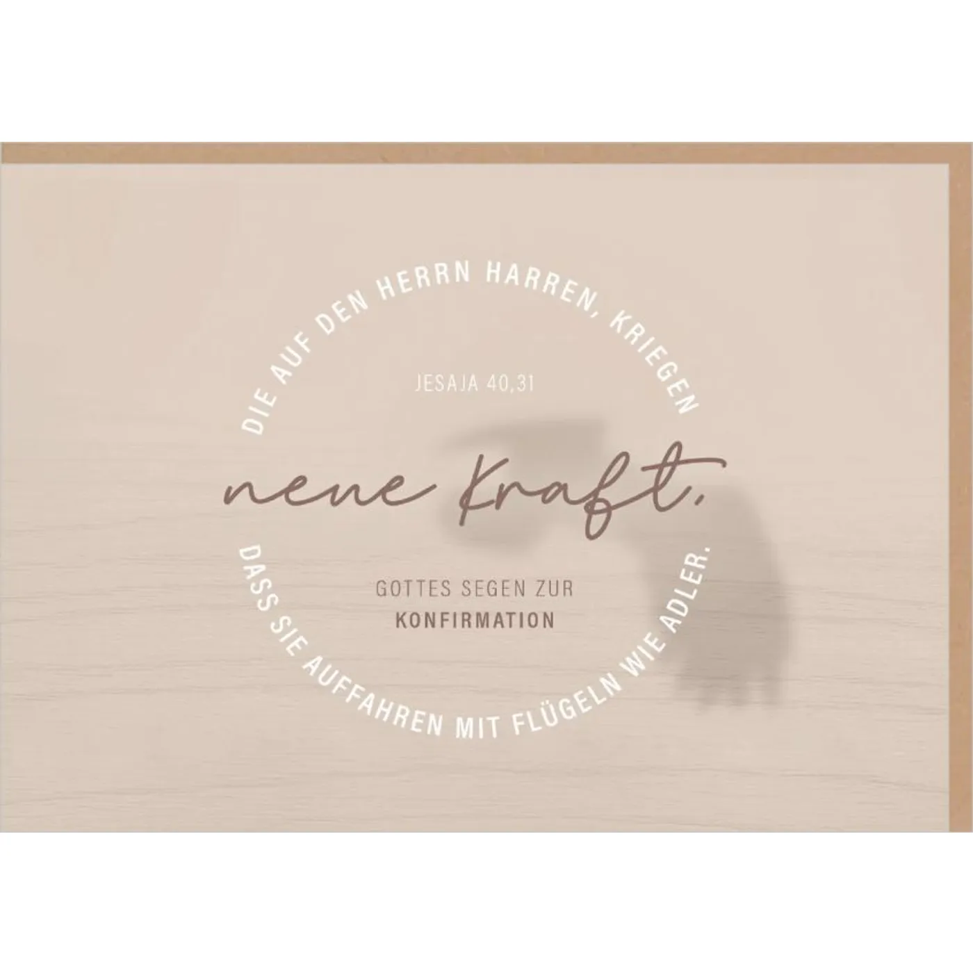 Übermittle besondere Segenswünsche zur Konfirmation mit dieser modernen Karte aus der Fatzer Alive Serie. Auf der Vorderseite steht in Kreisform der Text: „Die auf den Herrn harren, kriegen neue Kraft, dass sie auffahren mit Flügeln wie Adler.“ Der Schatten eines Vogels ergänzt das Design und unterstreicht die Botschaft von Stärke und Hoffnung. Innerhalb des Kreises ist die Versangabe Jesaja 40,31 sowie die Aufschrift „Gottes Segen zur Konfirmation“ platziert.