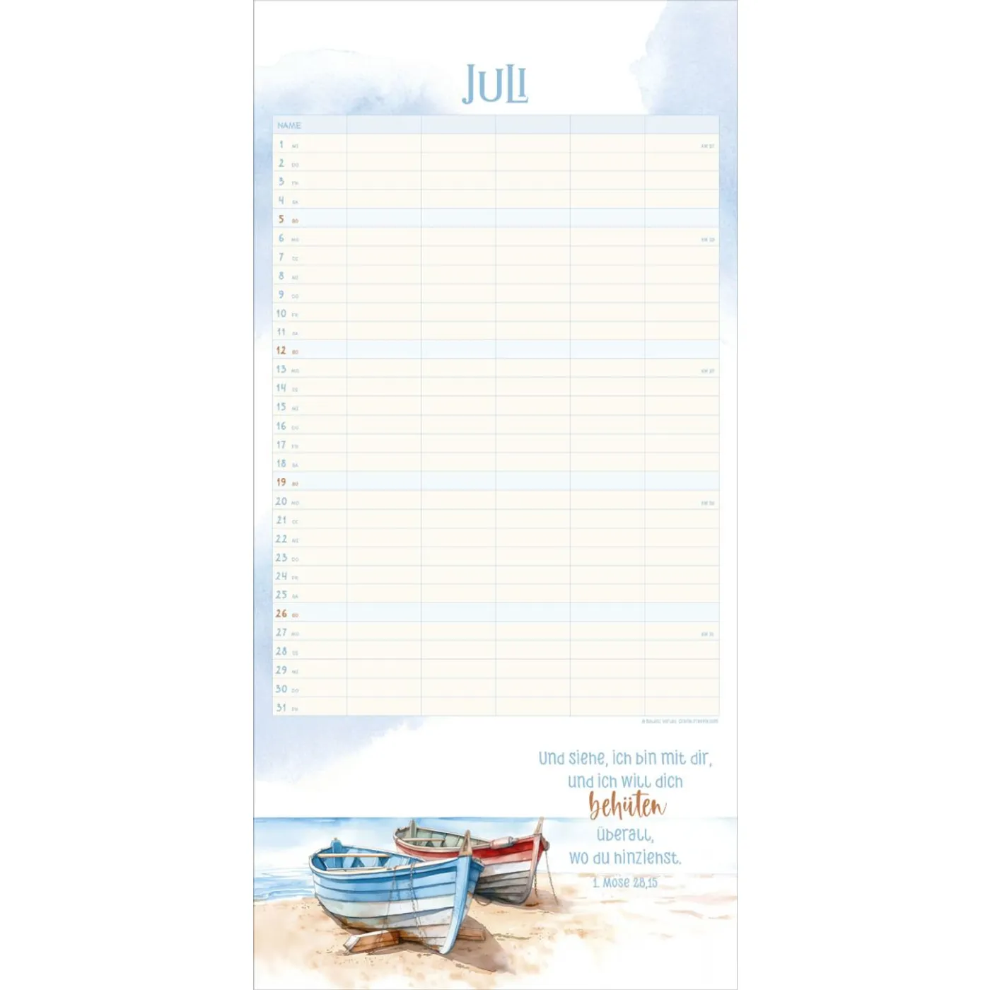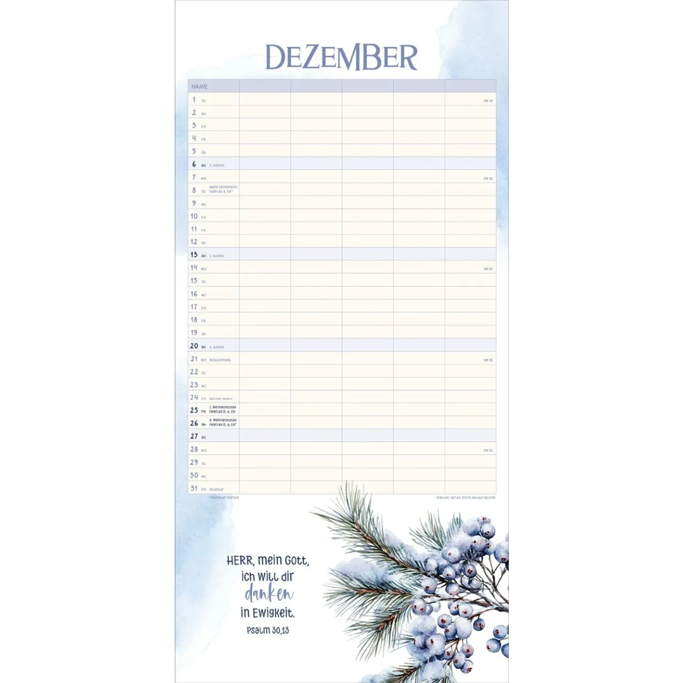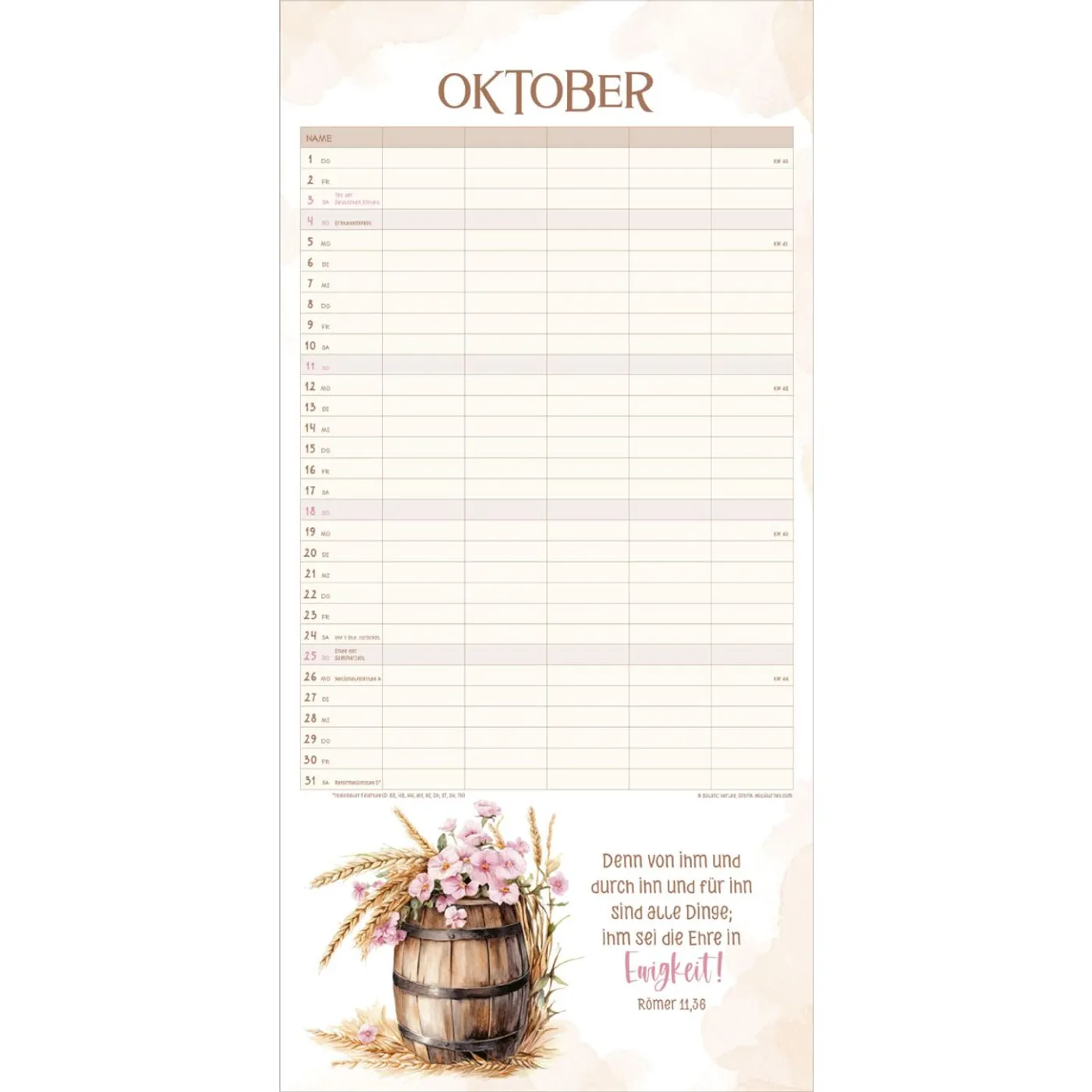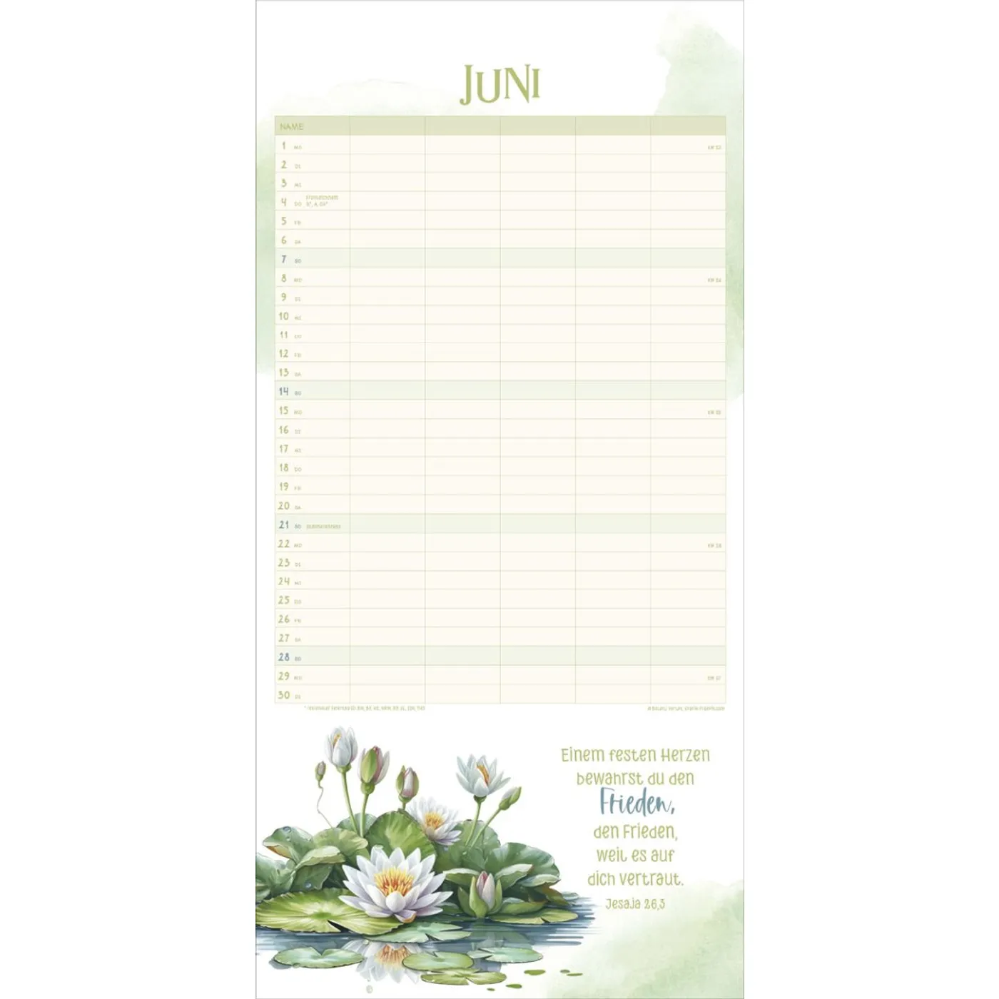Der kreativ gestaltete Familienplaner mit fünf Spalten bietet Platz für jede Menge Termine und Eintragungen. Außerdem ist der Kalender im Lettering-Stil ein echter Hingucker und verschönert jede Wand. Last but not least bringen Ihnen die Bibelworte und Zitate Gottes Wort näher und begleiten die Familie den ganzen Tag.