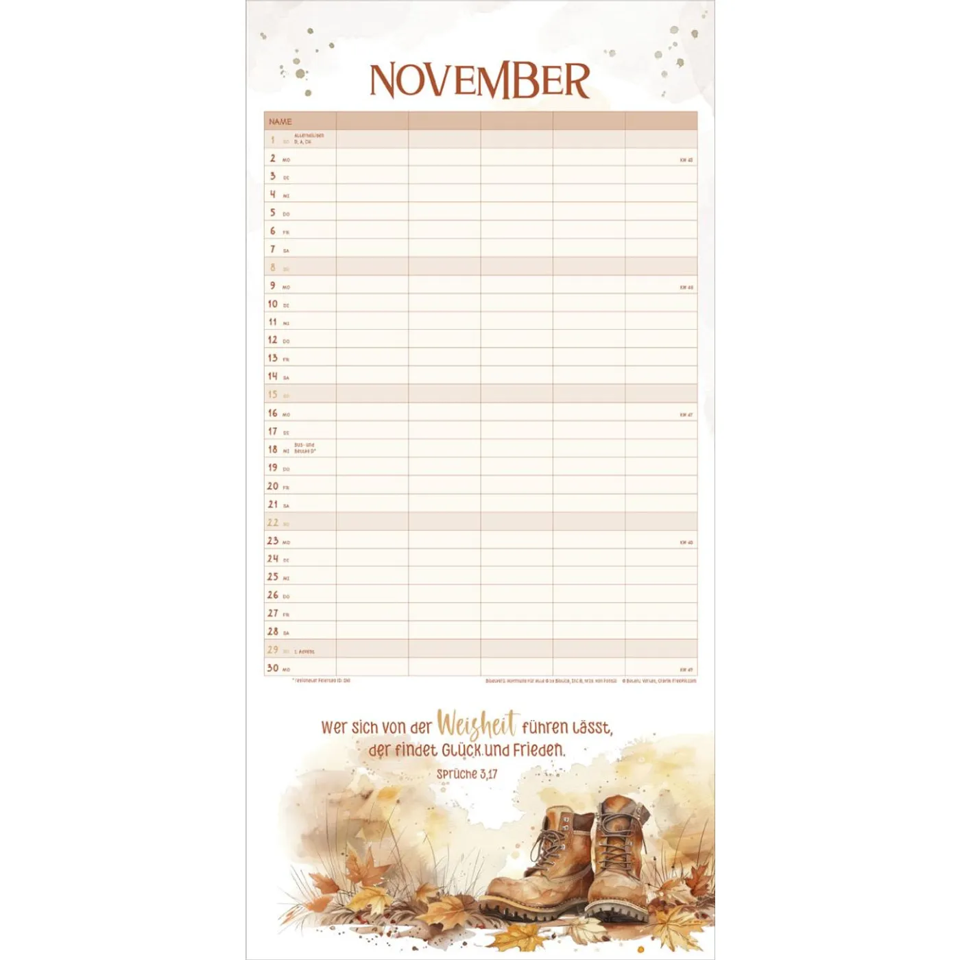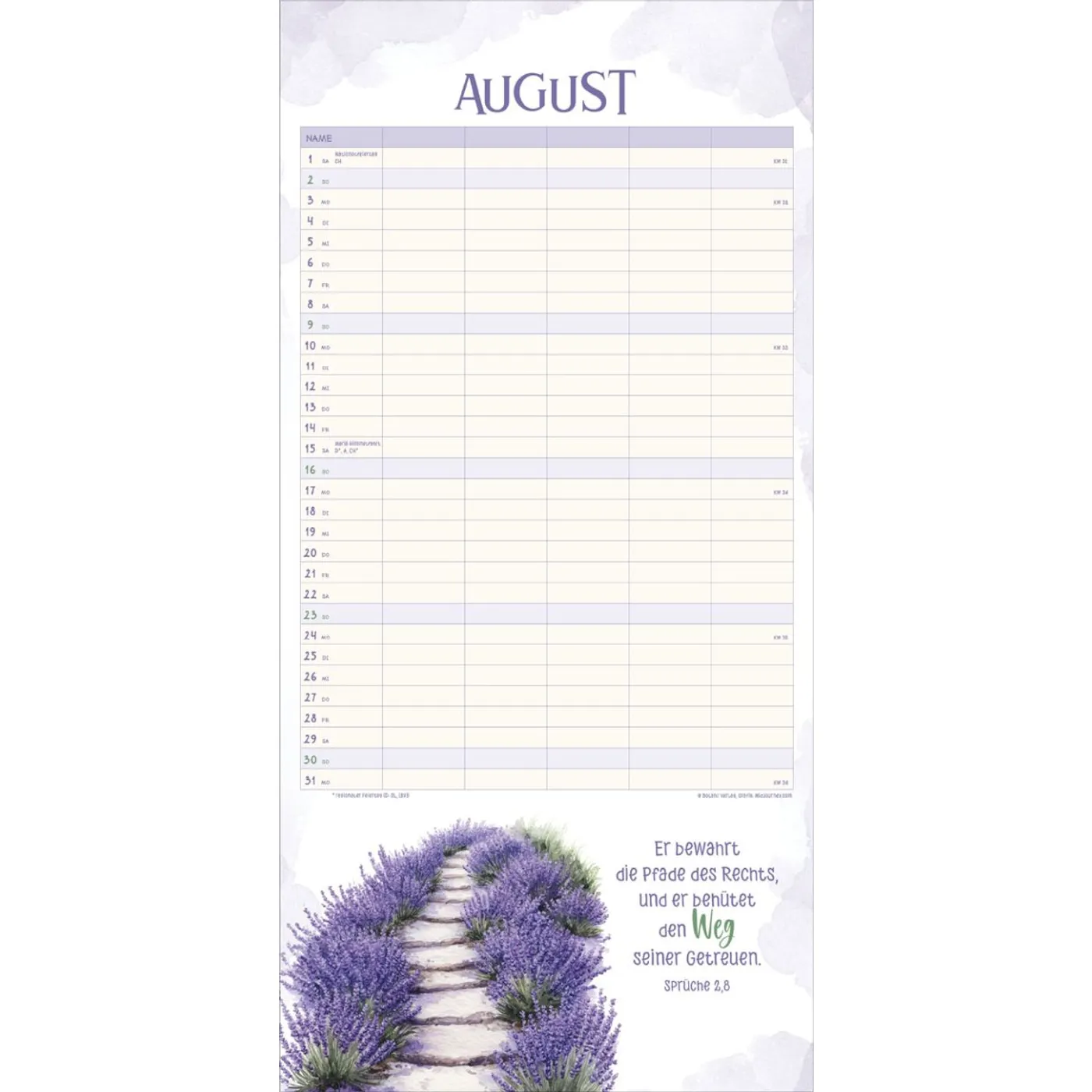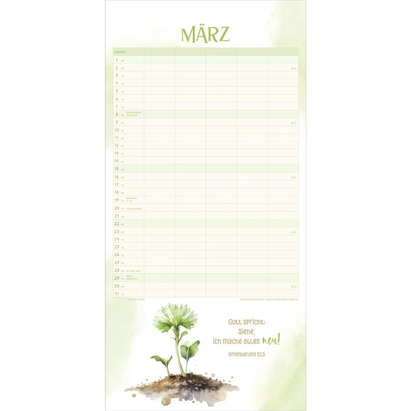 Der kreativ gestaltete Familienplaner mit fünf Spalten bietet Platz für jede Menge Termine und Eintragungen. Außerdem ist der Kalender im Lettering-Stil ein echter Hingucker und verschönert jede Wand. Last but not least bringen Ihnen die Bibelworte und Zitate Gottes Wort näher und begleiten die Familie den ganzen Tag.