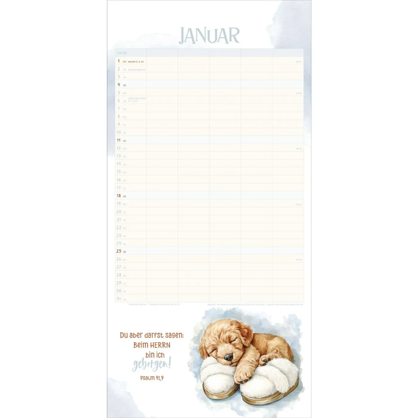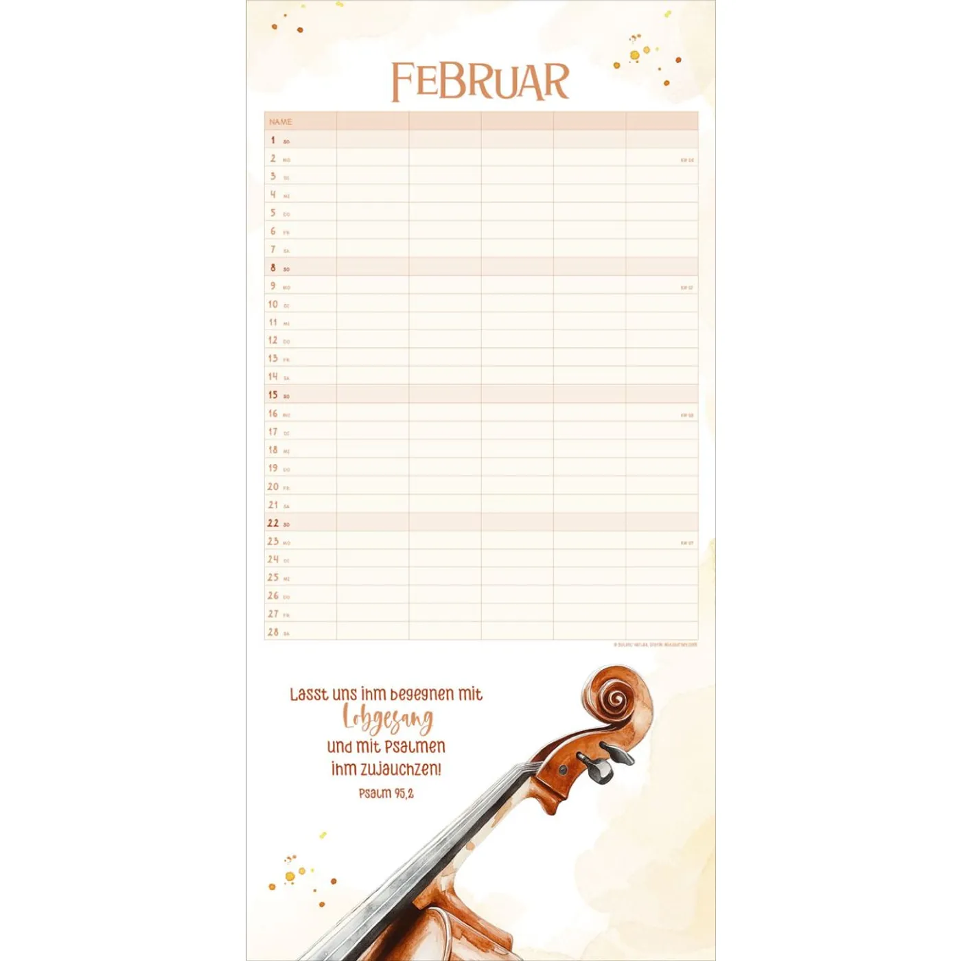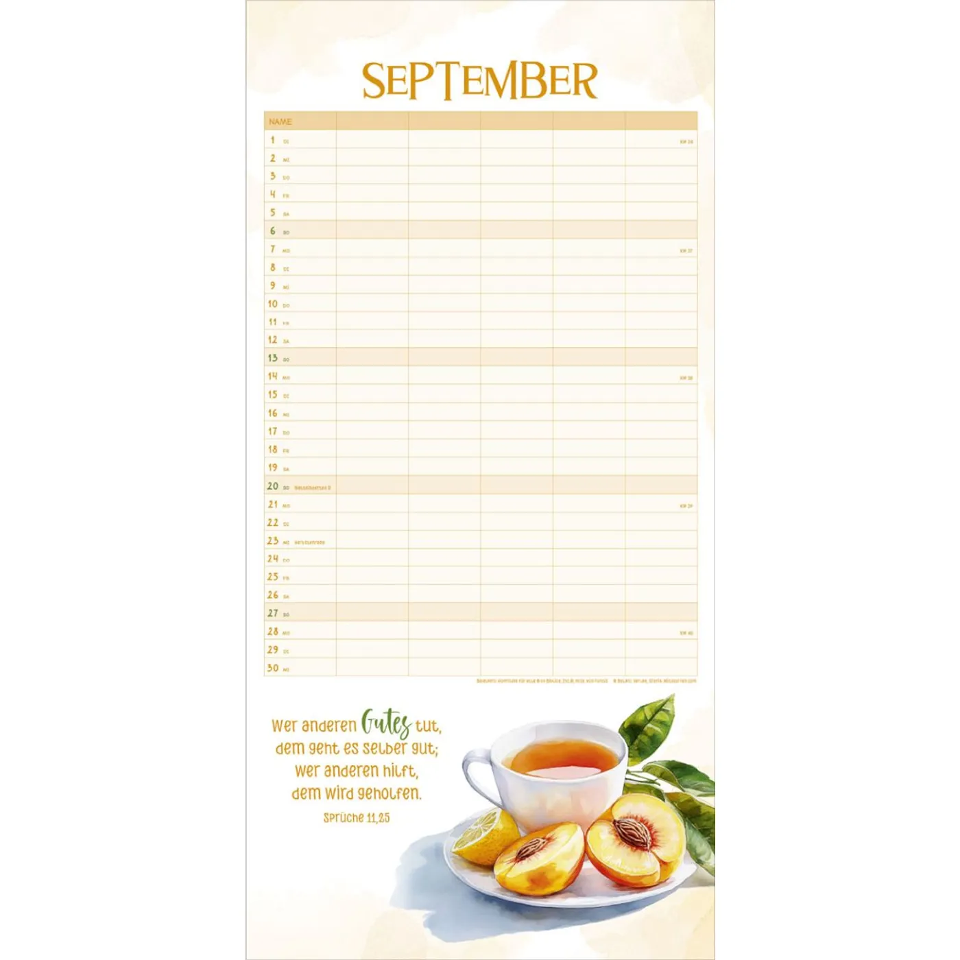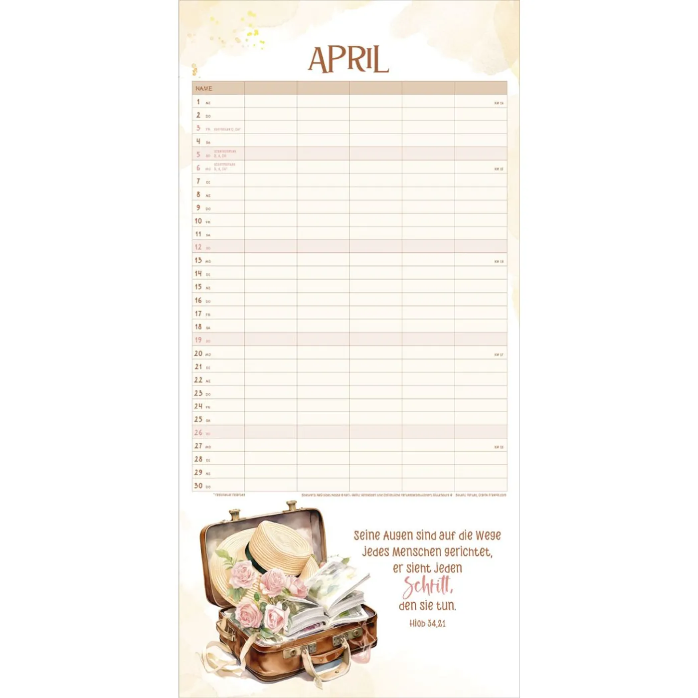 Der kreativ gestaltete Familienplaner mit fünf Spalten bietet Platz für jede Menge Termine und Eintragungen. Außerdem ist der Kalender im Lettering-Stil ein echter Hingucker und verschönert jede Wand. Last but not least bringen Ihnen die Bibelworte und Zitate Gottes Wort näher und begleiten die Familie den ganzen Tag.
