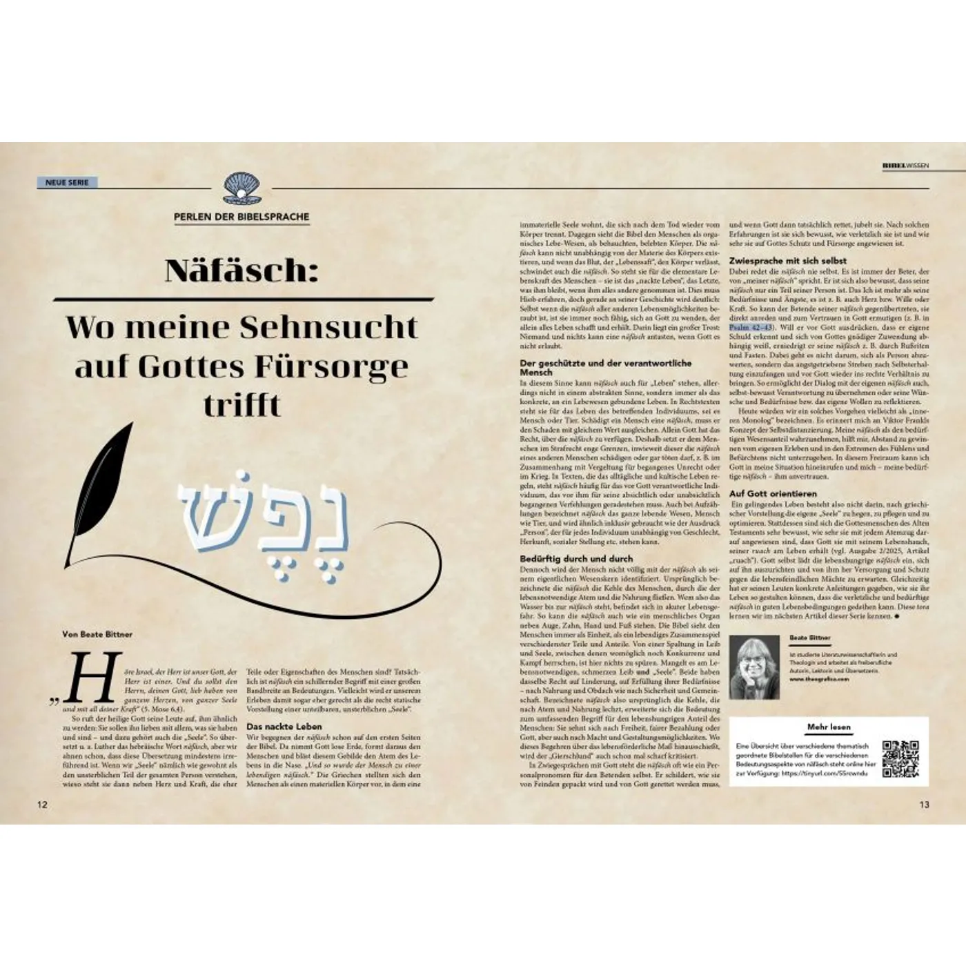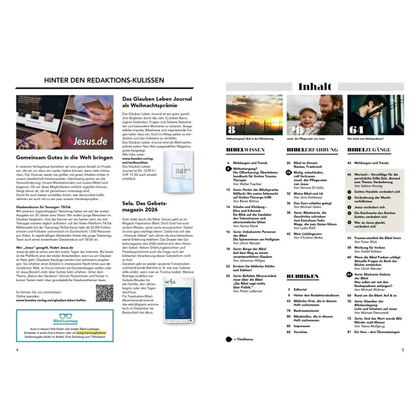 Faszination Bibel will dabei helfen, die Bibel mehr und tiefer zu verstehen. Jede Ausgabe lädt dazu ein, ihre Kraft zu erfahren und ihre Relevanz für das eigene Leben zu erfassen. Der Mix aus faszinierenden Hintergrundwissen und persönlichen Erfahrungsberichten verschafft dem Leser mit jedem Heft neue Aha-Erlebnisse. Faszination Bibel will dazu ermutigen, in der Stillen Zeit Neues auszuprobieren und so den individuellen Zugang zur Bibel (neu) zu entdecken. Faszination Bibel ist ein Magazin mit bleibendem Nutzwert – zum immer wieder aufschlagen und nachlesen. Zusätzlich zu den vier regulären Ausgaben erhalten die Leser im Abonnement jährlich ein hochwertiges monothematisches Sonderheft. Die Faszination Bibel-Themen: BibelWissen: Der Bibel vertrauen und ihre wegweisende Wahrheit erkennen. Das gelingt am besten mit fundierten Hintergründen und erstaunlichen Erkenntnissen aus Archäologie und Bibelwissenschaften. So eröffnet sich ein ganz neuer Blick auf Bekanntes. BibelErfahrung: Die Bibel ist das lebendige Wort Gottes. Es wirkt und trägt, bietet Weisheit und Lebensperspektiven, die wirklich halten. Das erfahren Menschen immer wieder und werden so zur Inspiration für den eigenen Alltag mit Gott. BibelZugänge: Im überfüllten Alltag erscheint der eigene Zugang zur Bibel oft versperrt. Bibelmüdigkeit macht sich breit, und es gibt eine große Sehnsucht nach Gottes heilsamer Botschaft. „BibelZugänge“ bietet verschiedene Blickwinkel auf eine zentrale biblische Aussage. Eine Einladung zur persönlichen stillen Zeit, die Lust macht, die Stellen in der Bibel nachzulesen.
