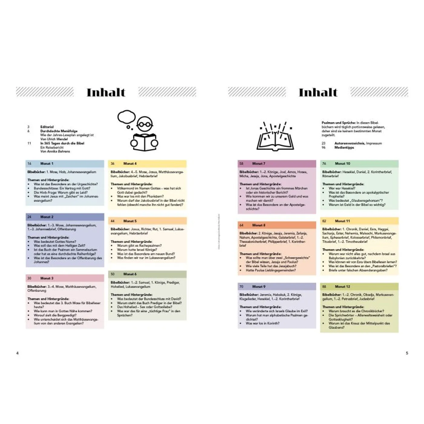Die Ein-Jahres-Reise durch die Bibel ist das Thema des diesjährigen Specials von Faszination Bibel. Das Heft enthält einen durchdachten Leseplan. Für jeden Tag gibt es vier verschiedene Text-Sorten aus Altem und Neuem Testament. Die Reihenfolge im Alten Testament richtet sich ungefähr nach der Chronologie der erzählten Ereignisse. So werden z. B. die Propheten in den Ablauf der Geschichtsbücher eingebettet. Im Neuen Testament sind die Texte nach theologisch zusammengehörigen Gruppen geordnet. So werden faszinierende Zusammenhänge sichtbar. Darüber hinaus gibt es für jeden Lesemonat Hintergrundinformationen zu den betreffenden Bibeltexten. Erfahrungsberichte von Menschen, die so eine Lese-Reise schon einmal gemacht haben, runden das Special ab.