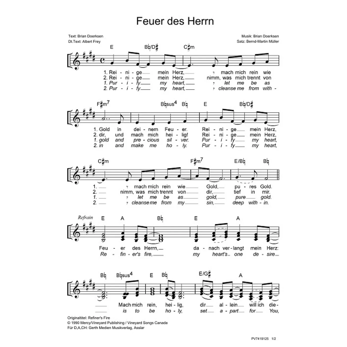 Feuer des Herrn (diese Variante haben Sie gerade ausgewählt) (dreistimmig, gemischter Chor, mit Akkorden, E-Dur) Brian Doerksen (Komposition, Text), Bernd-Martin Müller (Chorsatz), Albert Frey (Übersetzung) |