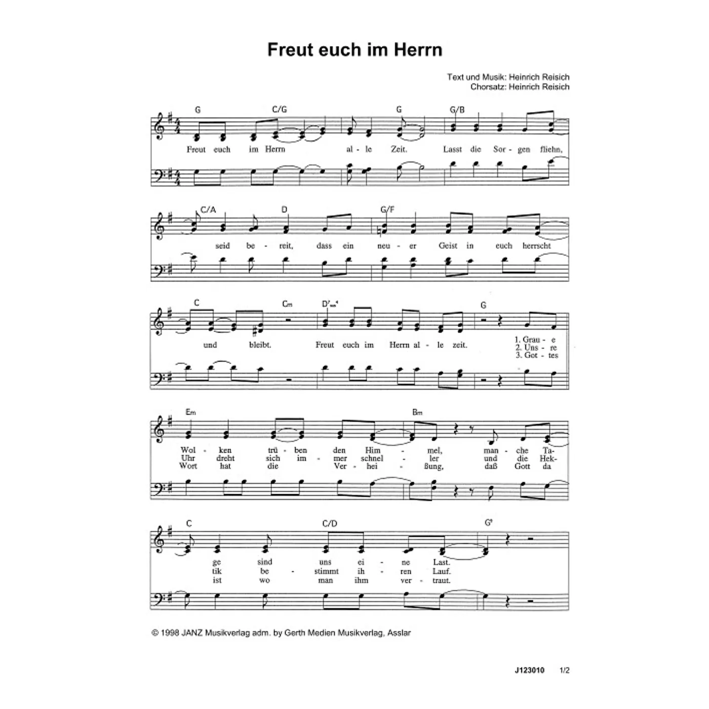 Freut euch im Herrn (diese Variante haben Sie gerade ausgewählt) (modern, gemischter Chor, mit Akkorden, vierstimmig, G-Dur) Heinrich Reisich (Komposition, Text, Chorsatz) |
