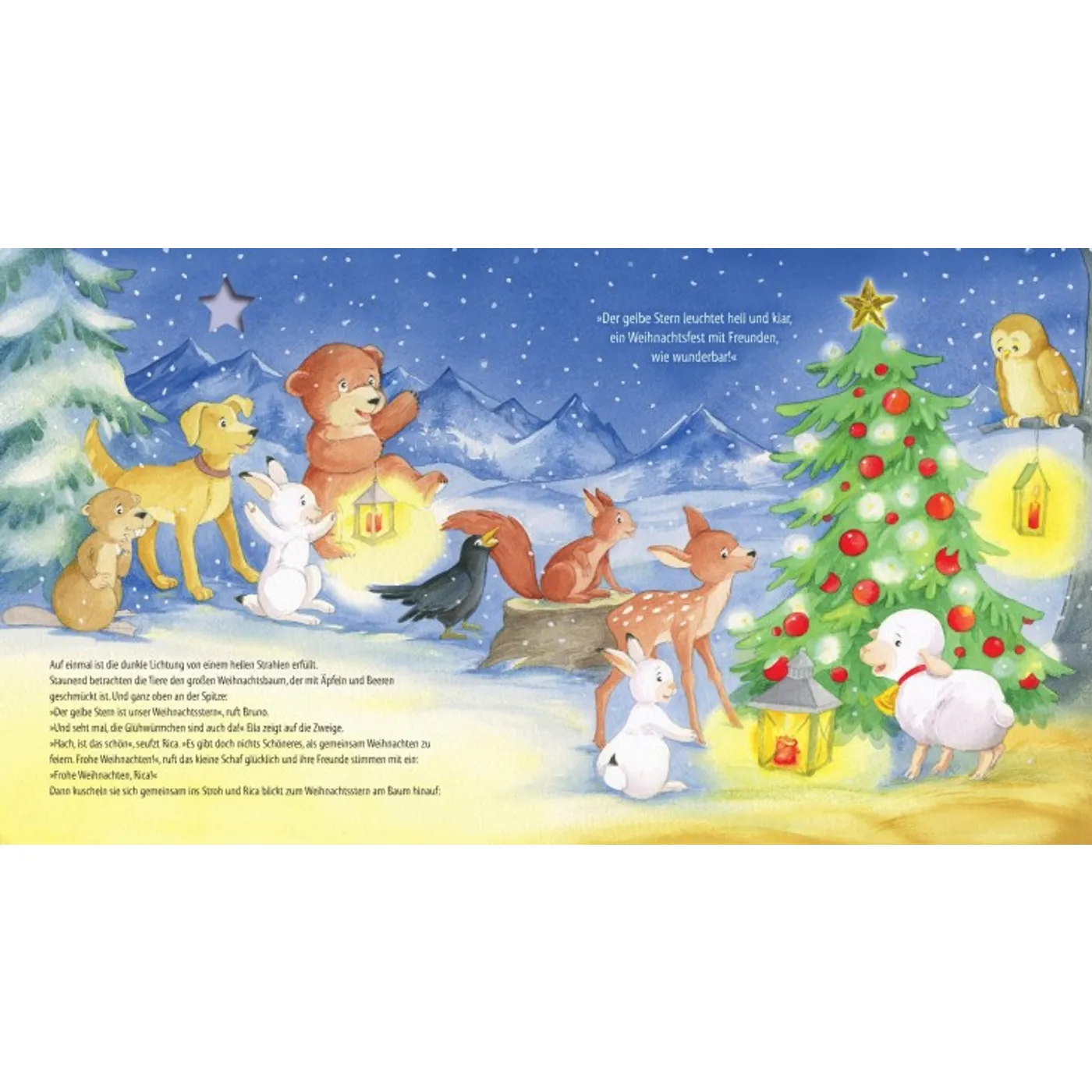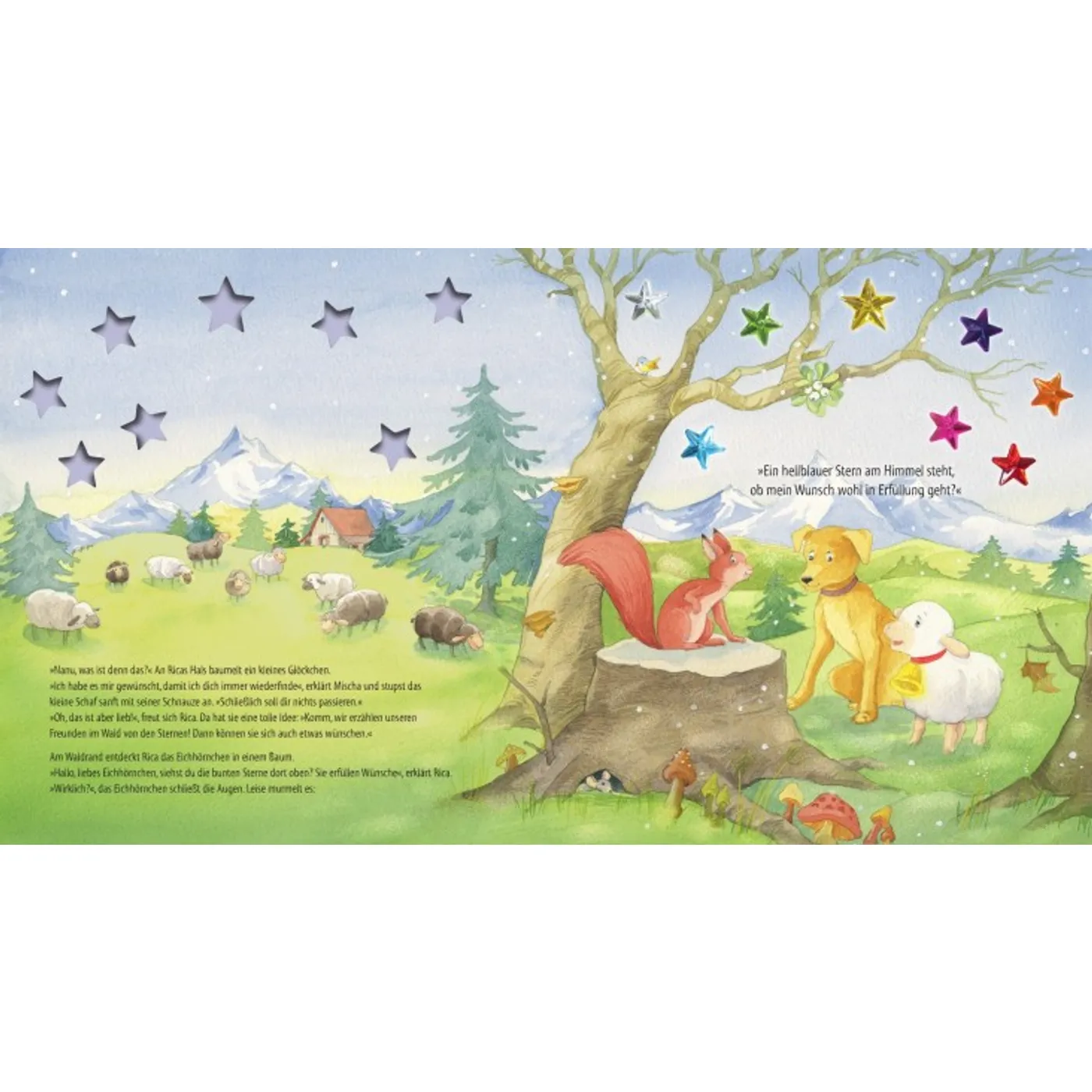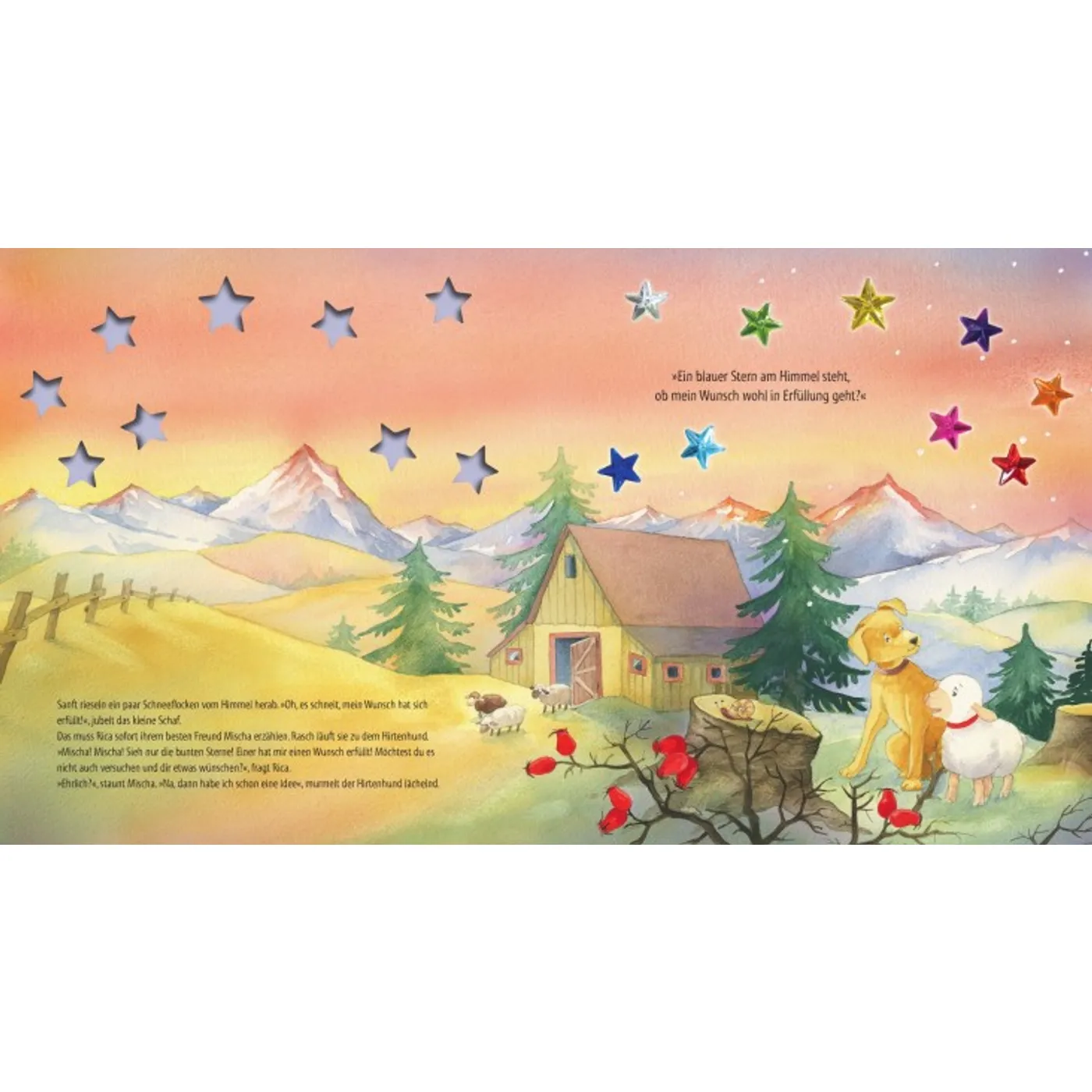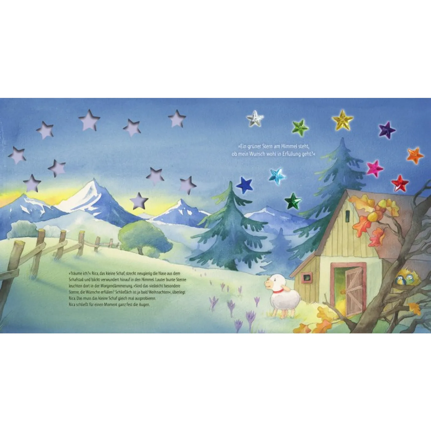 10 bunte Sterne leuchten und funkeln am dunklen Morgenhimmel. Das kleine Schaf Rica spürt sofort, dass dies besondere Weihnachtssterne sein müssen. Und tatsächlich, jeder Stern erfüllt einen Wunsch!