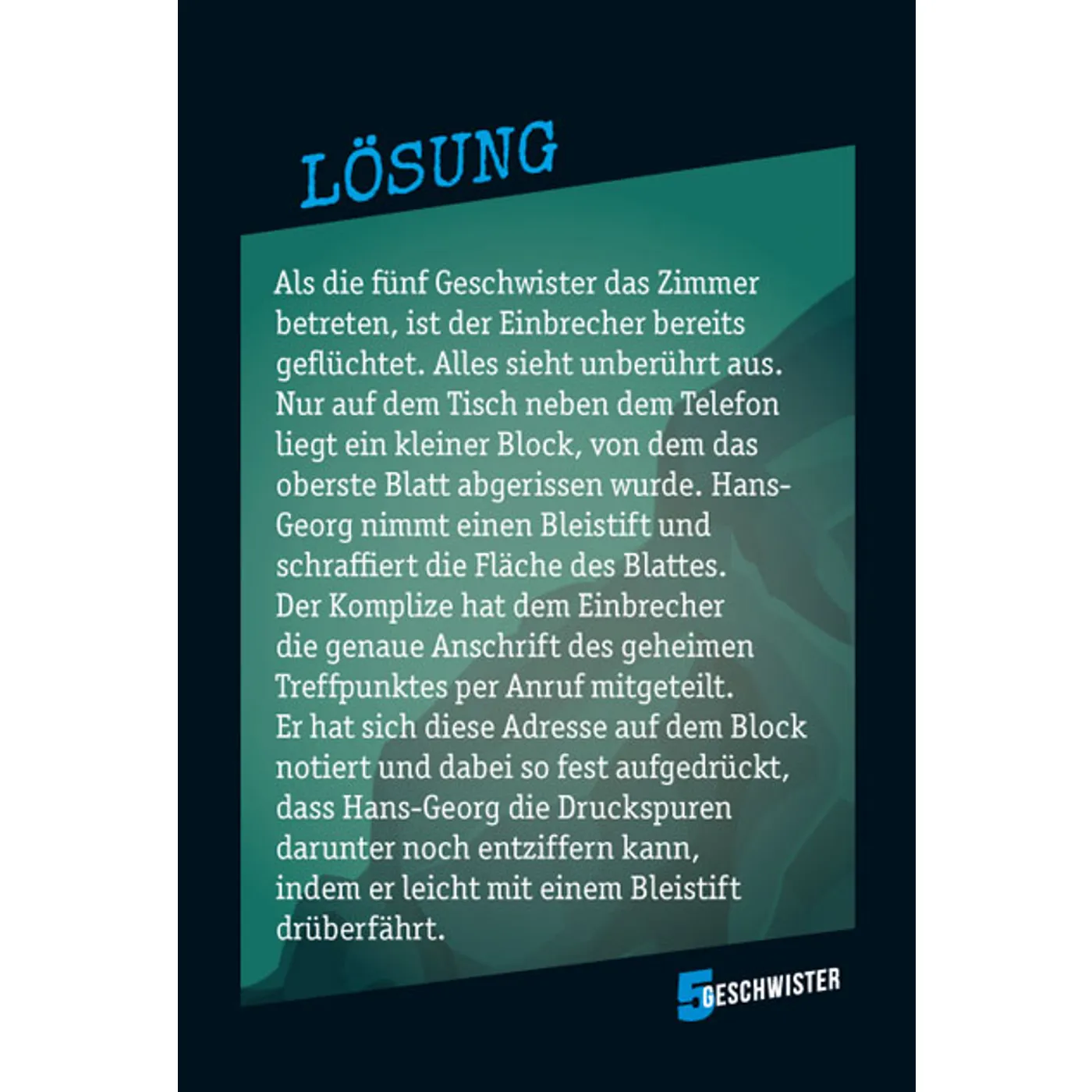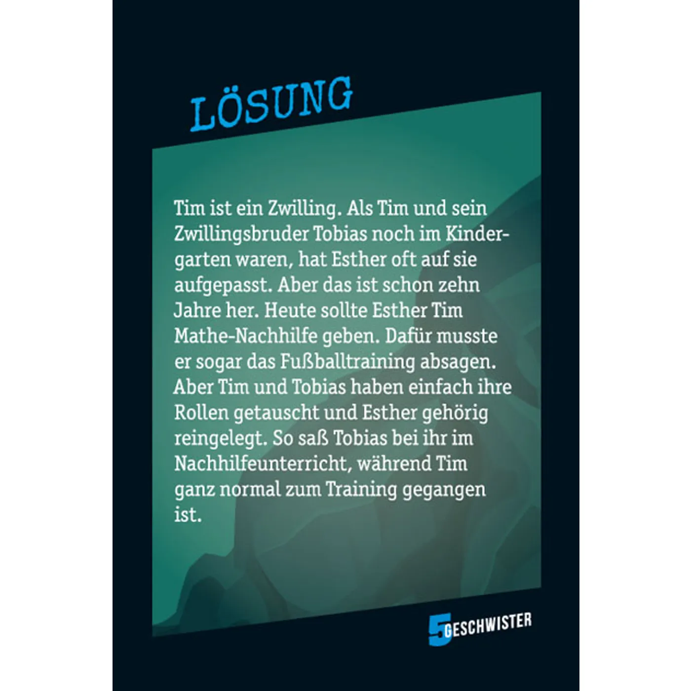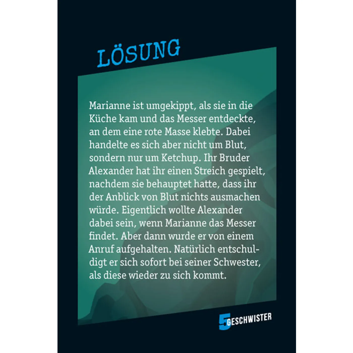 Der ultimative Spiele-Spaß mit den "5 Geschwistern": 60 verzwickte Rätsel aus aller Herren Länder mit unglaublichen Vorkommnissen an geheimen Orten. Das ultimative "5 Geschwister"-Kartenspiel schickt Rätselfreunde ab acht Jahren auf Verbrecherjagd - und lässt sie spannende Fälle lösen. Dabei gilt es, mit "Ja" oder "Nein"-Fragen die wahren Vorkommnisse hinter den Fakten zu erraten. Spielespaß kommt schon ab zwei Spielern auf - noch interessanter wird es in einer größeren Gruppe.