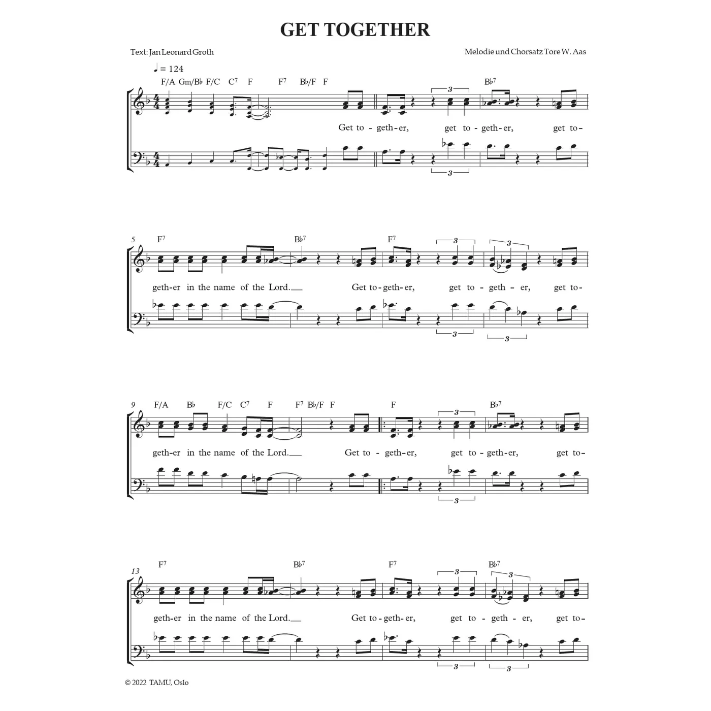 Get Together (diese Variante haben Sie gerade ausgewählt) (Gospel & Soul, dreistimmig, gemischter Chor, F-Dur) Tore W. Aas (Melodie, Chorsatz), Jan Leonard Groth (Text) |
