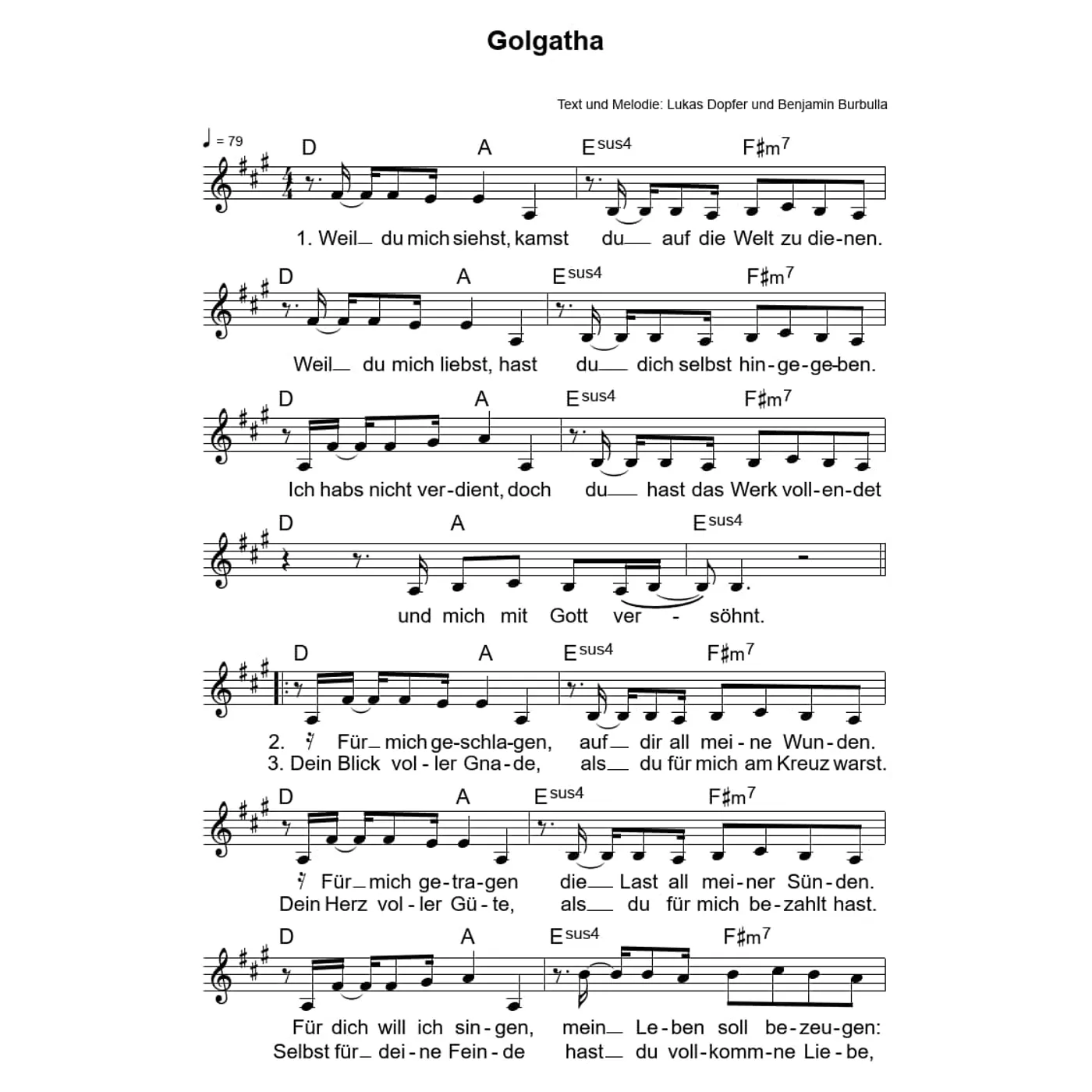 Golgatha (diese Variante haben Sie gerade ausgewählt) (Worship, einstimmig, A-Dur) Benjamin Burbulla (Melodie, Text), Lukas Dopfer (Text, Melodie) |