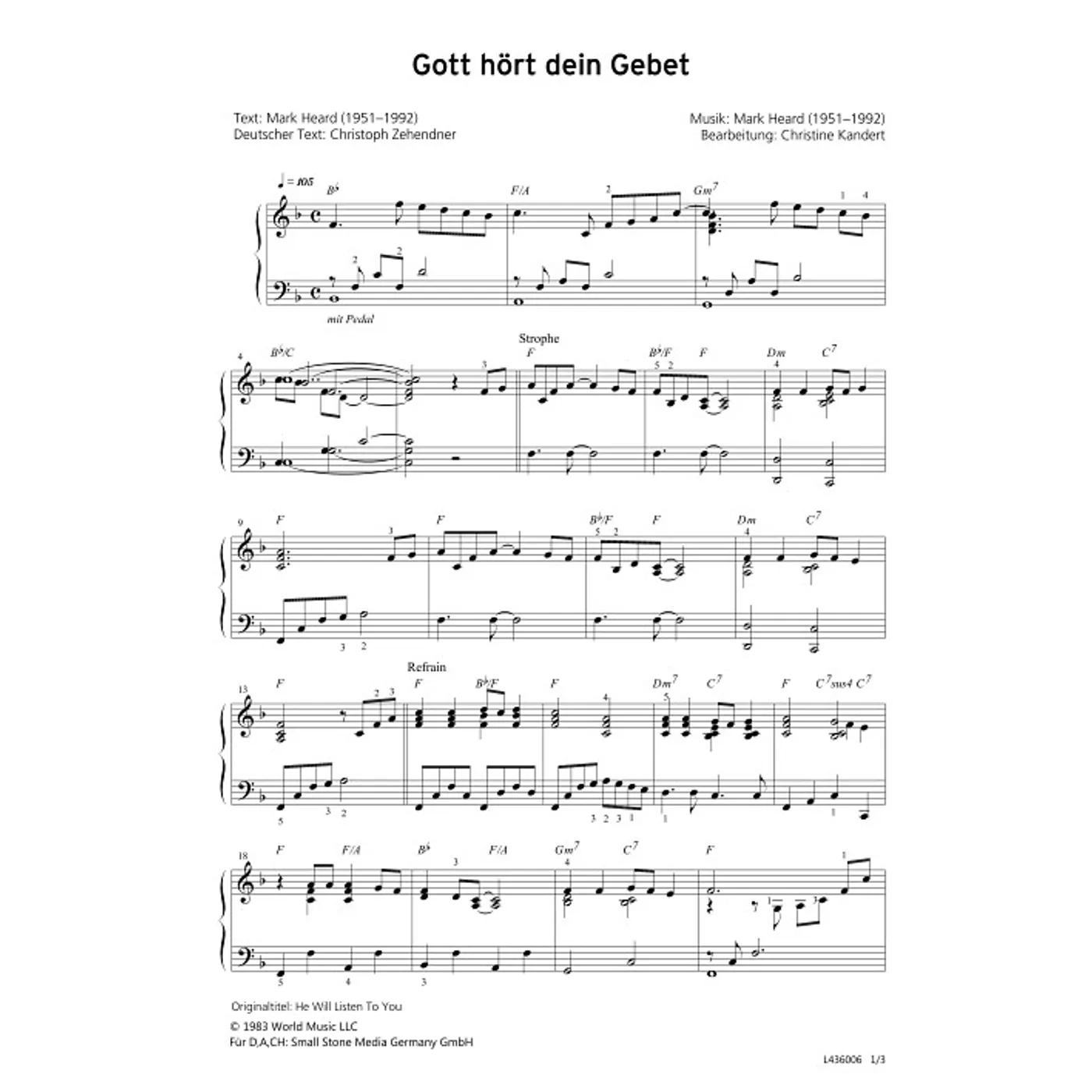 Gott hört dein Gebet (diese Variante haben Sie gerade ausgewählt) (Klavier, Klavierpartitur, Partituren, gemischter Chor, mit Akkorden, F-Dur) Mark Heard (Komposition, Text), Christine Kandert (Klaviersatz), Christoph Zehendner (Übersetzung) |