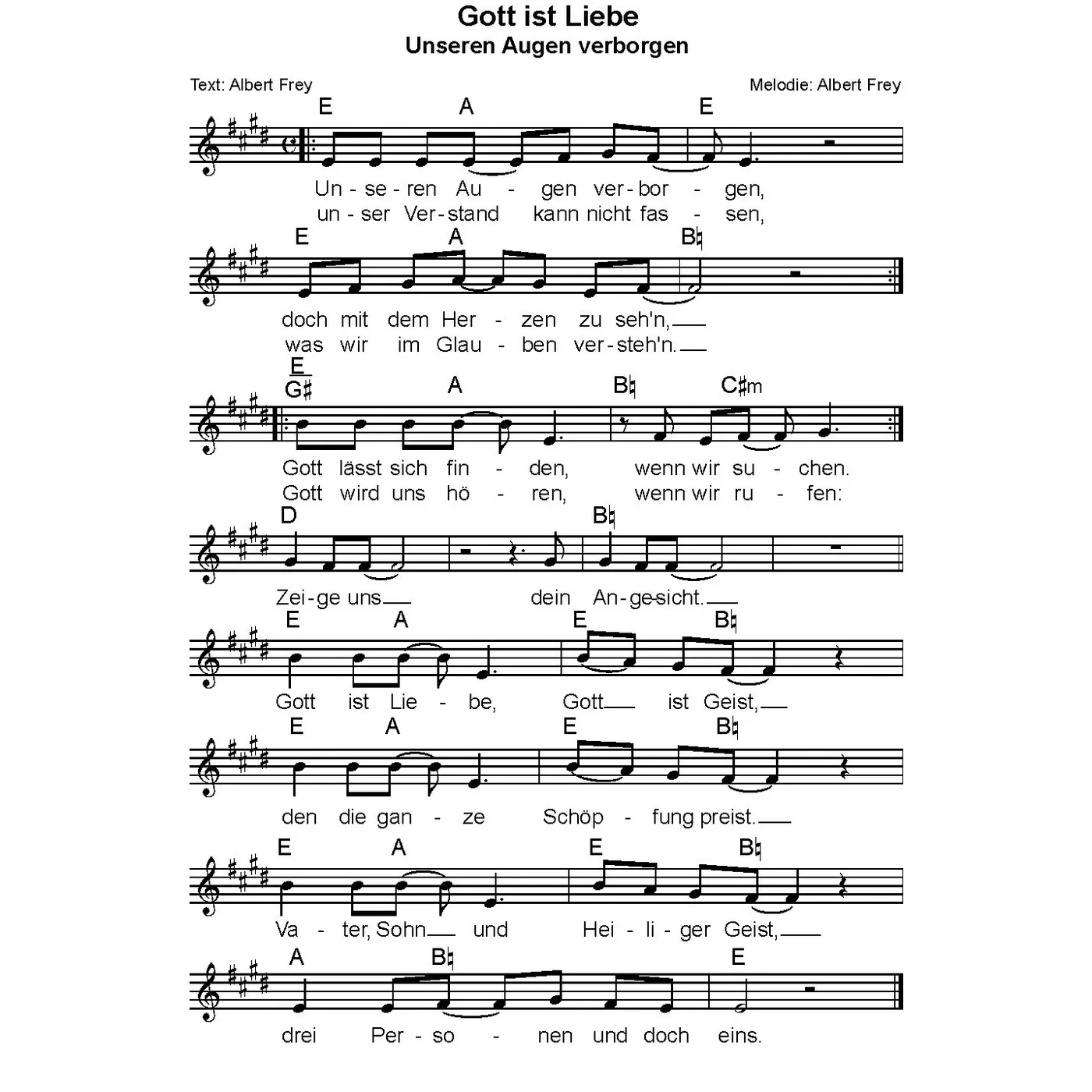 Gott ist Liebe (diese Variante haben Sie gerade ausgewählt) (Worship, einstimmig, E-Dur, Andante (92), Viertel) Albert Frey (Text, Melodie) |