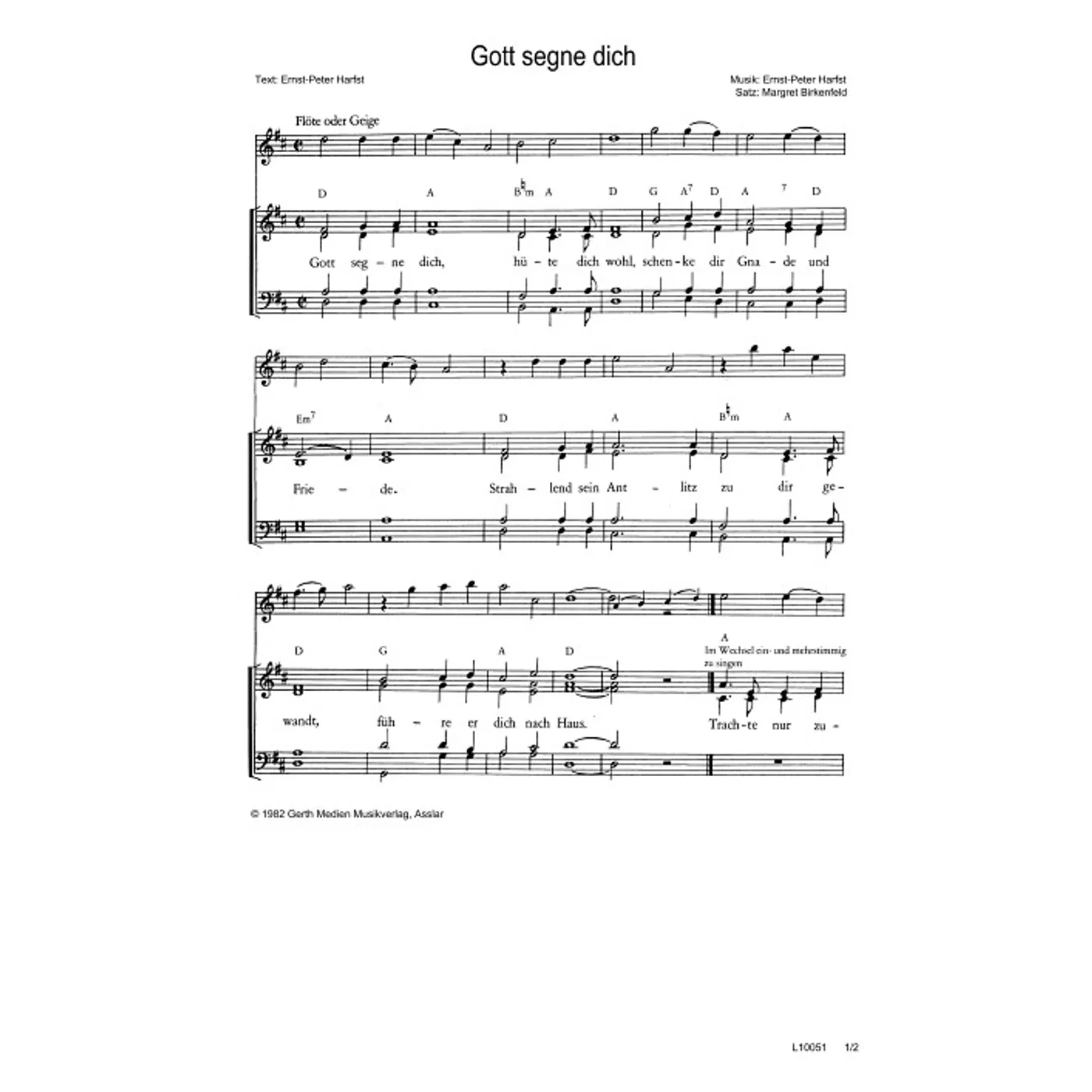 (traditionell, gemischter Chor, mit Akkorden, vierstimmig, D-Dur) Ernst-Peter Harfst (Komposition, Text), Margret Birkenfeld (Chorsatz)