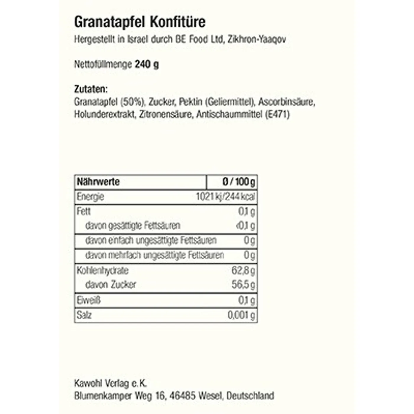 Zutaten: Granatapfel (50%), Zucker, Pektin, Zitronensäure, Vitamin C, Trinatriumcitrat (E331iii), E471), kann Spuren von Fruchtkernen enthalten