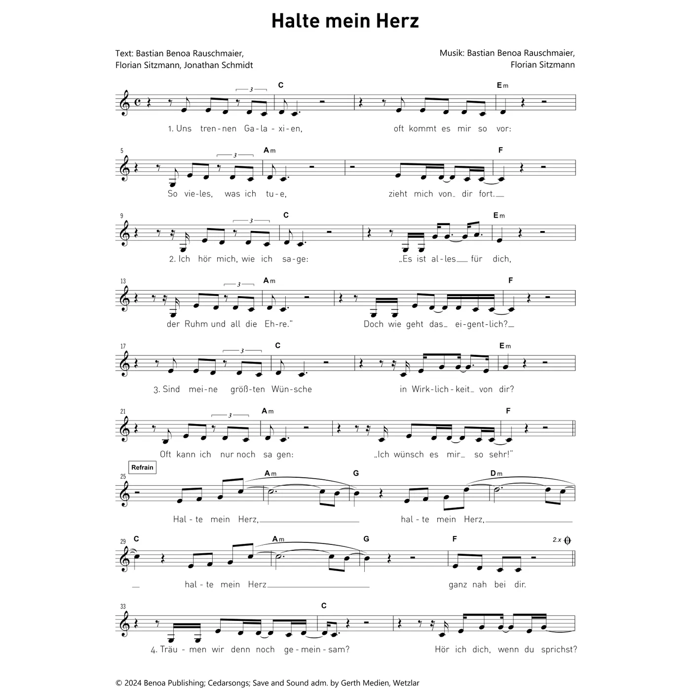 Halte mein Herz (diese Variante haben Sie gerade ausgewählt) (Pop & Rock, einstimmig, C-Dur) Bastian Benoa (Melodie, Text), Jonathan Schmidt (Text), Florian Sitzmann (Text, Melodie) |