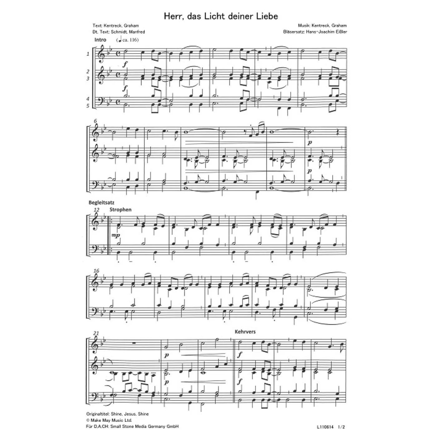 Herr, das Licht deiner Liebe (diese Variante haben Sie gerade ausgewählt) (Gemeindelied, modern, Bläser, Bläserpartitur, Partituren) Graham Kendrick (Komposition, Text), Hans-Joachim Eißler (Bläsersatz), Manfred Schmidt (Übersetzung) |
