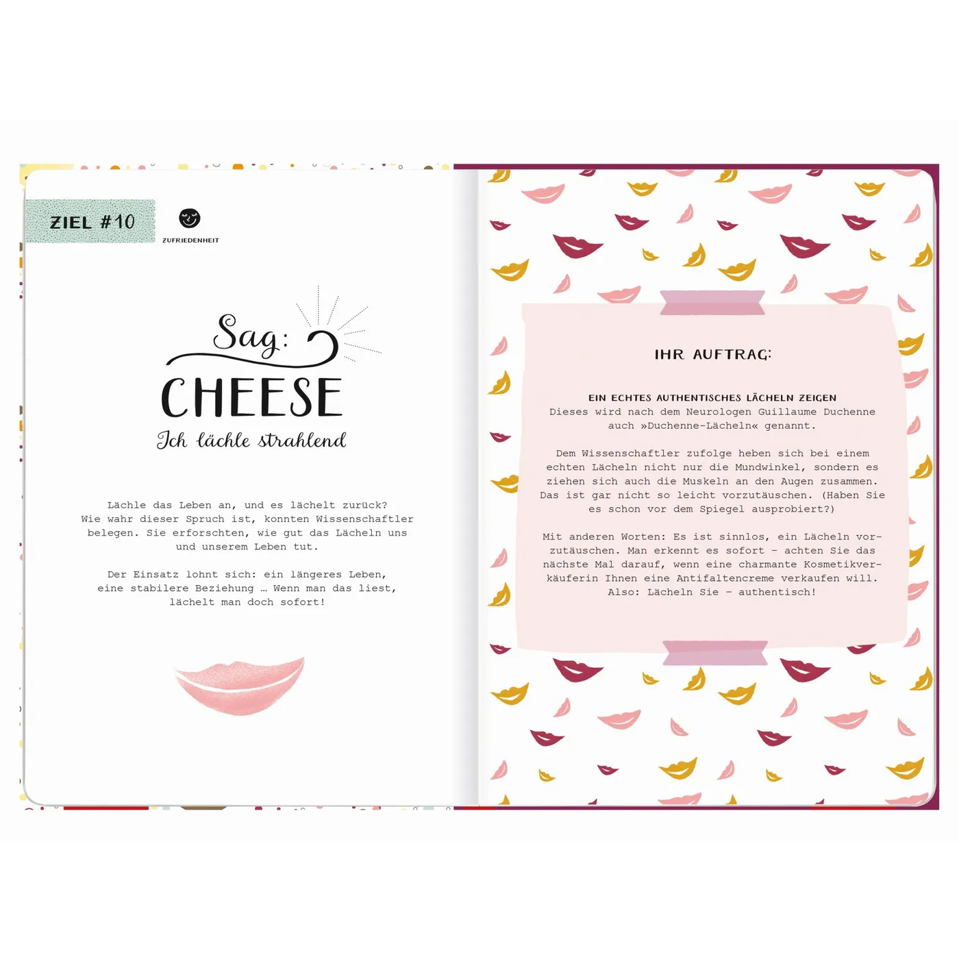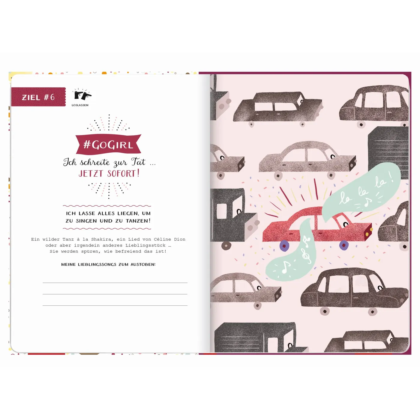 Jede Doppelseite gibt Tipps und Inspiration für mehr Selbstbewusstsein und Motivation im Alltag. Anregungen wie „Man ist glücklicher, wenn man anderen eine Freude macht. Schreibe eine Postkarte mit aufbauenden Worten an eine Freundin“, sind liebevoll typografisch gestaltet. Sie machen Lust, selbst kreativ zu werden. Die ansprechenden Illustrationen machen das Eintragbuch zum Ausfüllen zu etwas ganz besonderem. Es passt wunderbar in eine Handtasche und ist somit stets zur Hand, wenn eine kreative Idee das Licht der Welt erblickt.