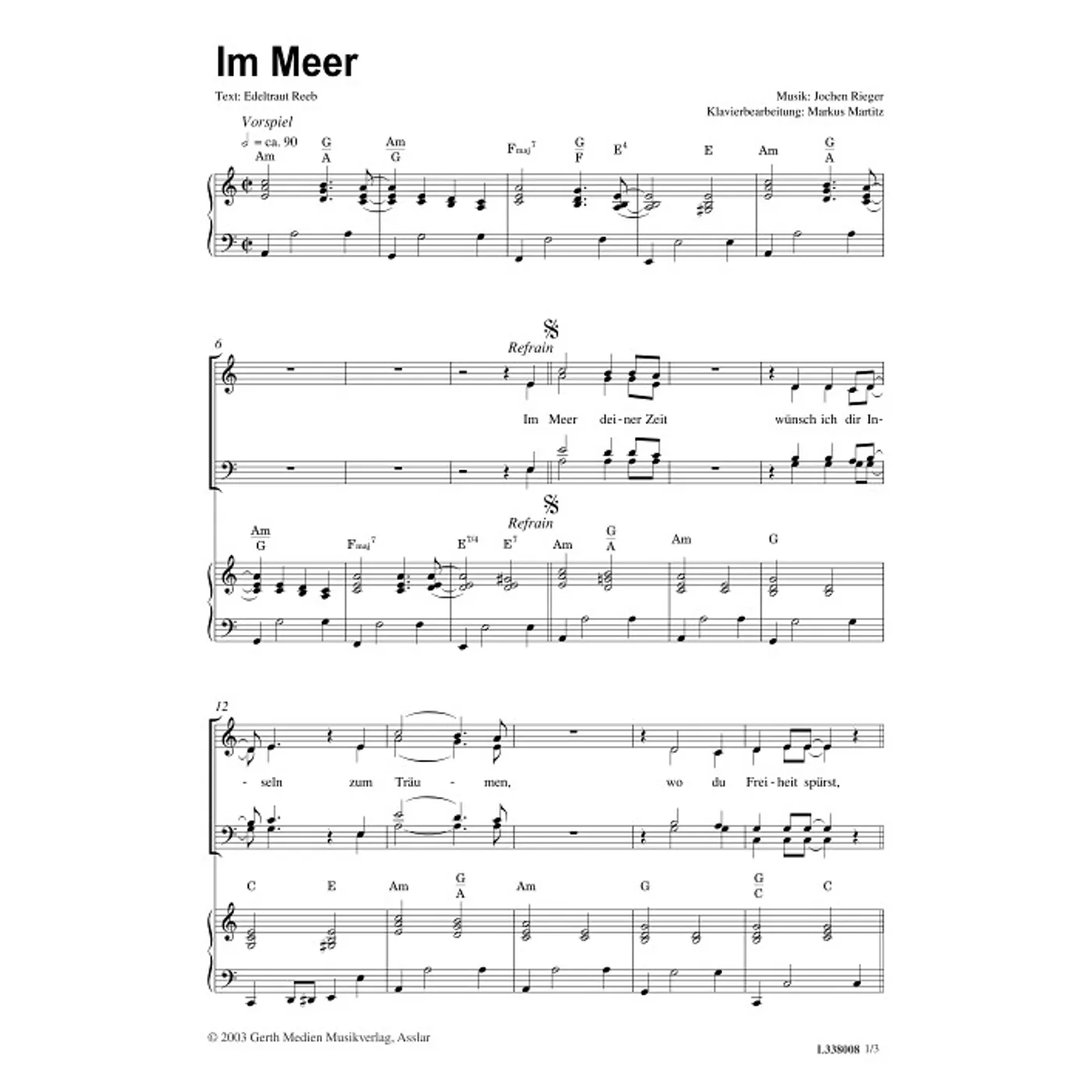 Im Meer (modern, gemischter Chor, mit Akkorden, vierstimmig, a-moll-Moll) Edeltraut Reeb (Text), Jochen Rieger (Bearbeiter, Komposition) | modern, gemischter Chor, mit Akkorden, vierstimmig, a-moll-Moll | 1,50 € |