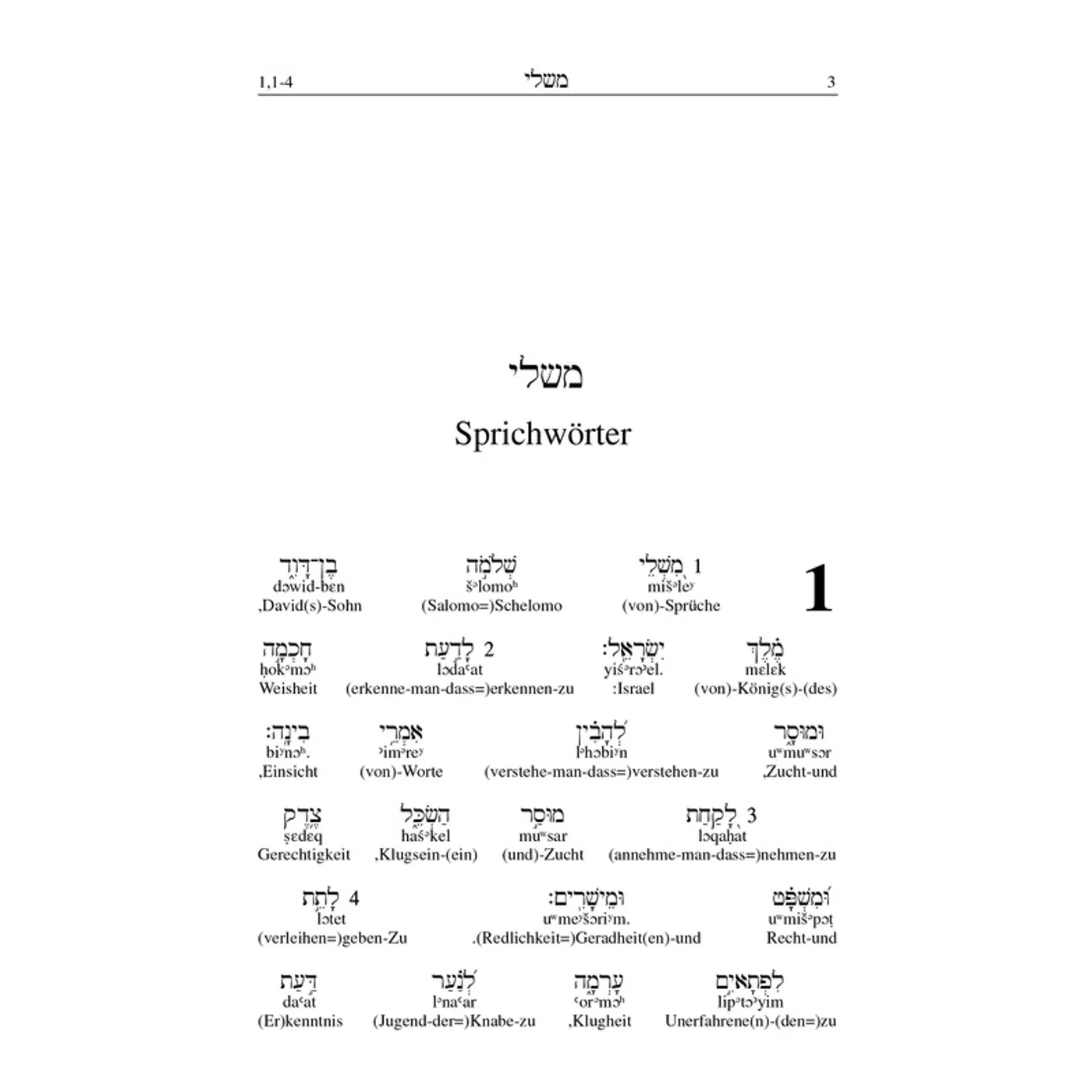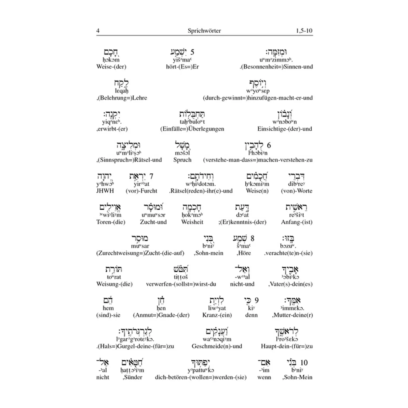 Endlich eine Möglichkeit, die biblische Botschaft aus der Originalquelle zu schöpfen! Der hebräische Grundtext, die Transkription des hebräischen Textes und die deutsche Übersetzung stehen direkt untereinander. So können Sie selbst nachprüfen, was im Urtext steht - und das auch ohne Fremdsprachenkenntnisse! Mit dem 5. Band ist diese herausragende Bibelausgabe jetzt abgeschlossen. Er bietet die Interlinearübersetzung zu Sprichwörter, Ruth, Hohelied, Prediger, Klagelieder, Esther, daniel, Esra, Nehemia, 1. Chronik und 2. Chronik.
