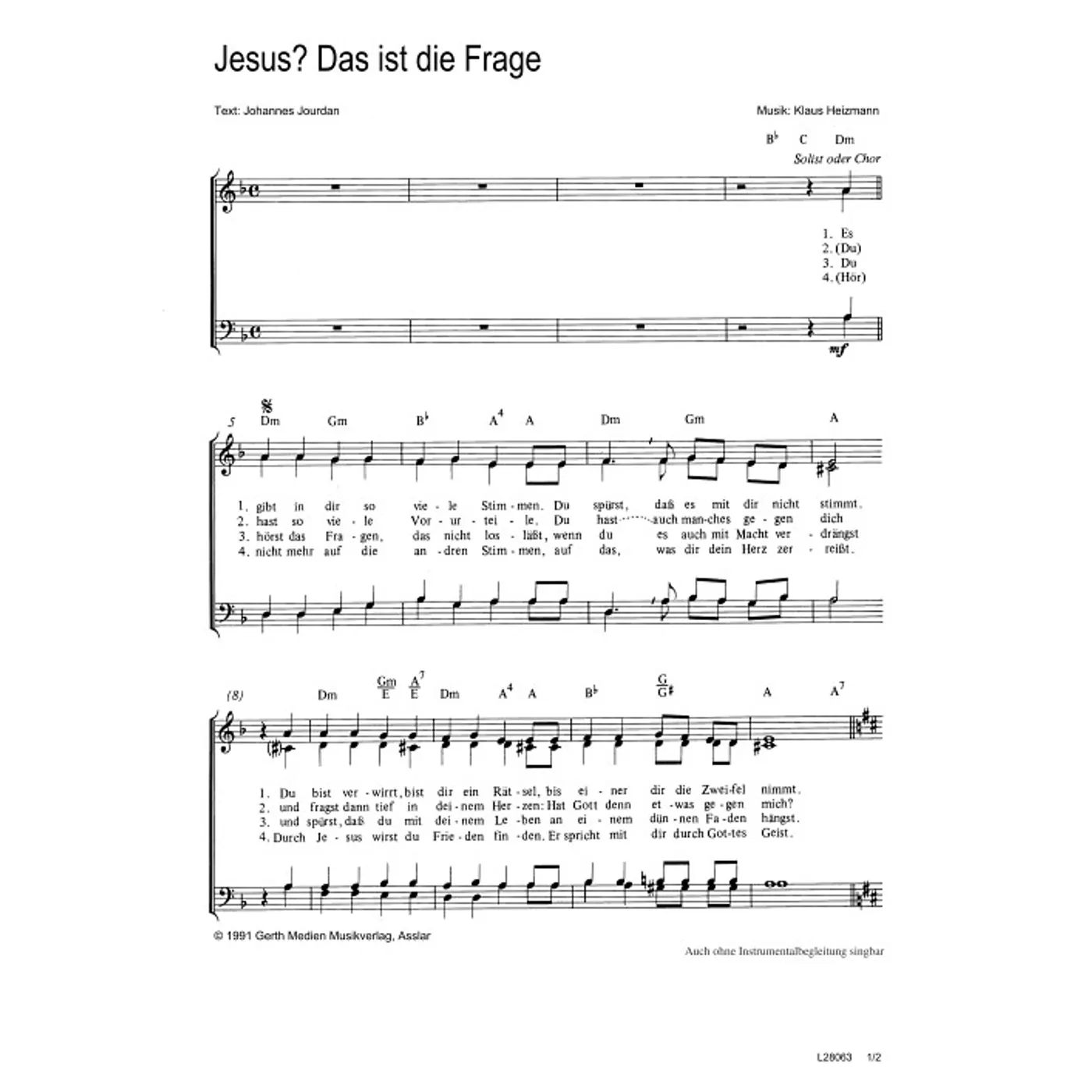 Jesus? Das ist die Frage (Klavier, gemischter Chor, mit Akkorden, vierstimmig, gleiche Reihe) Klaus Heizmann (Komposition), Johannes Jourdan (Text) | Klavier, gemischter Chor, mit Akkorden, vierstimmig, gleiche Reihe | 3,80 € |