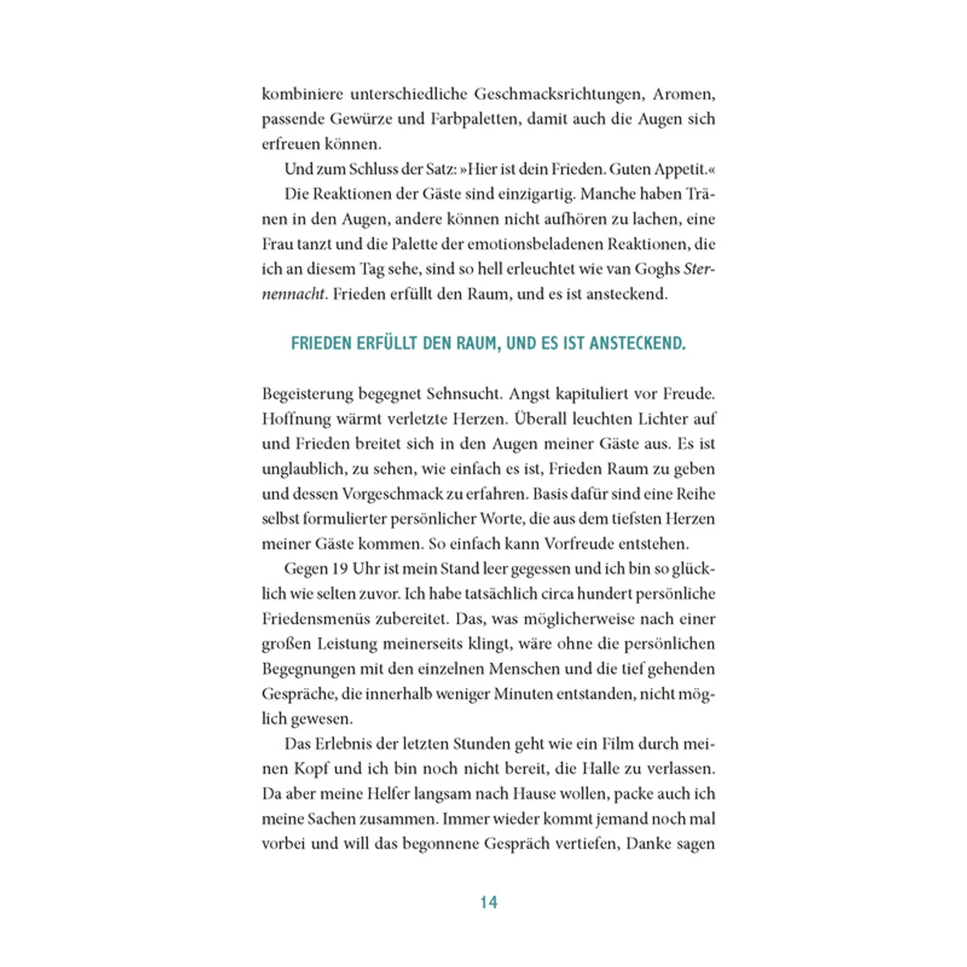 Auch die authentische Erzählweise und die inspirierenden Geschichten machen dieses Buch zu einer bereichernden Lektüre für alle, die nach Wegen suchen, Frieden im Alltag zu leben und Gemeinschaft zu fördern. Besonders positiv ist auch die Art und Weise, wie das Thema Frieden alltagsnah vermittelt wird – durch gemeinsames Kochen und Essen als Symbol für Zusammenhalt und Verständigung.