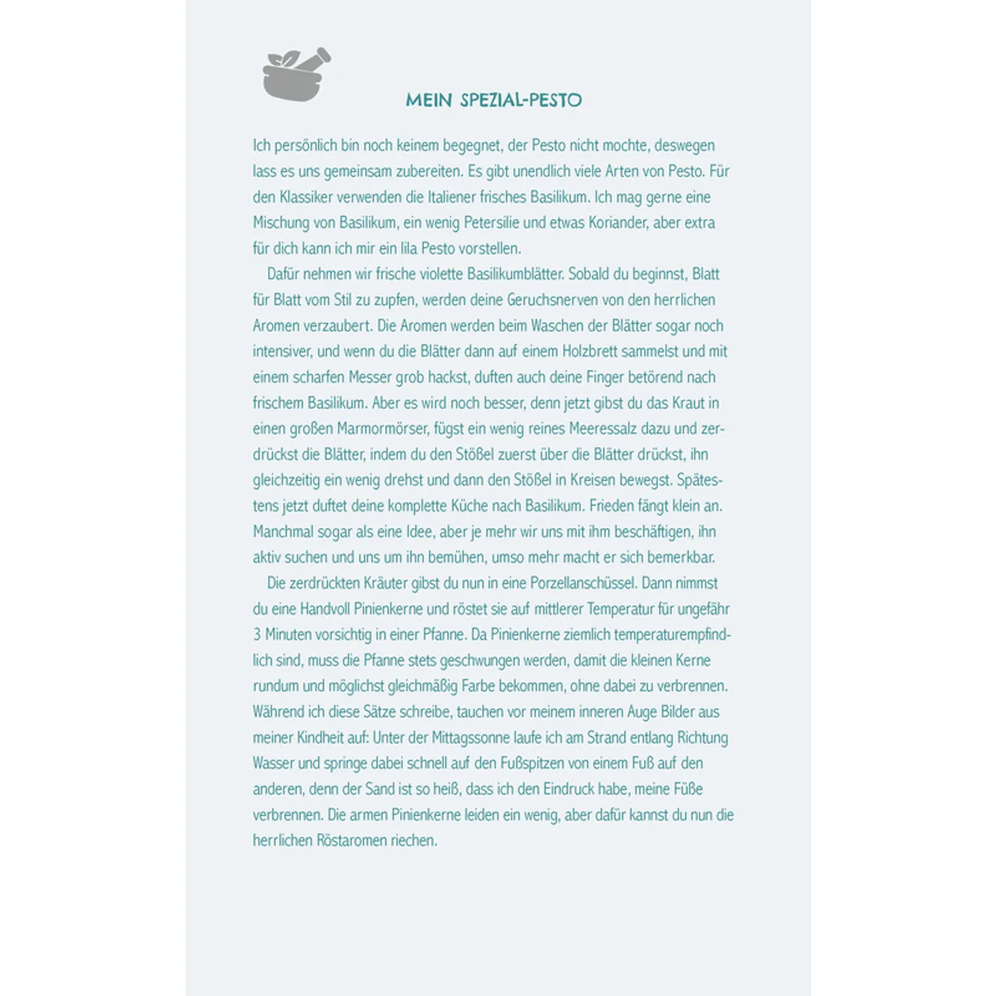 Seine Beschreibung des Pestorezepts ist so wunderbar, dass man es richtig schmecken kann und seine Begeisterung darüber kommt ganz wunderbar rüber. Man bekommt sofort Lust, auch Pesto zu machen.
