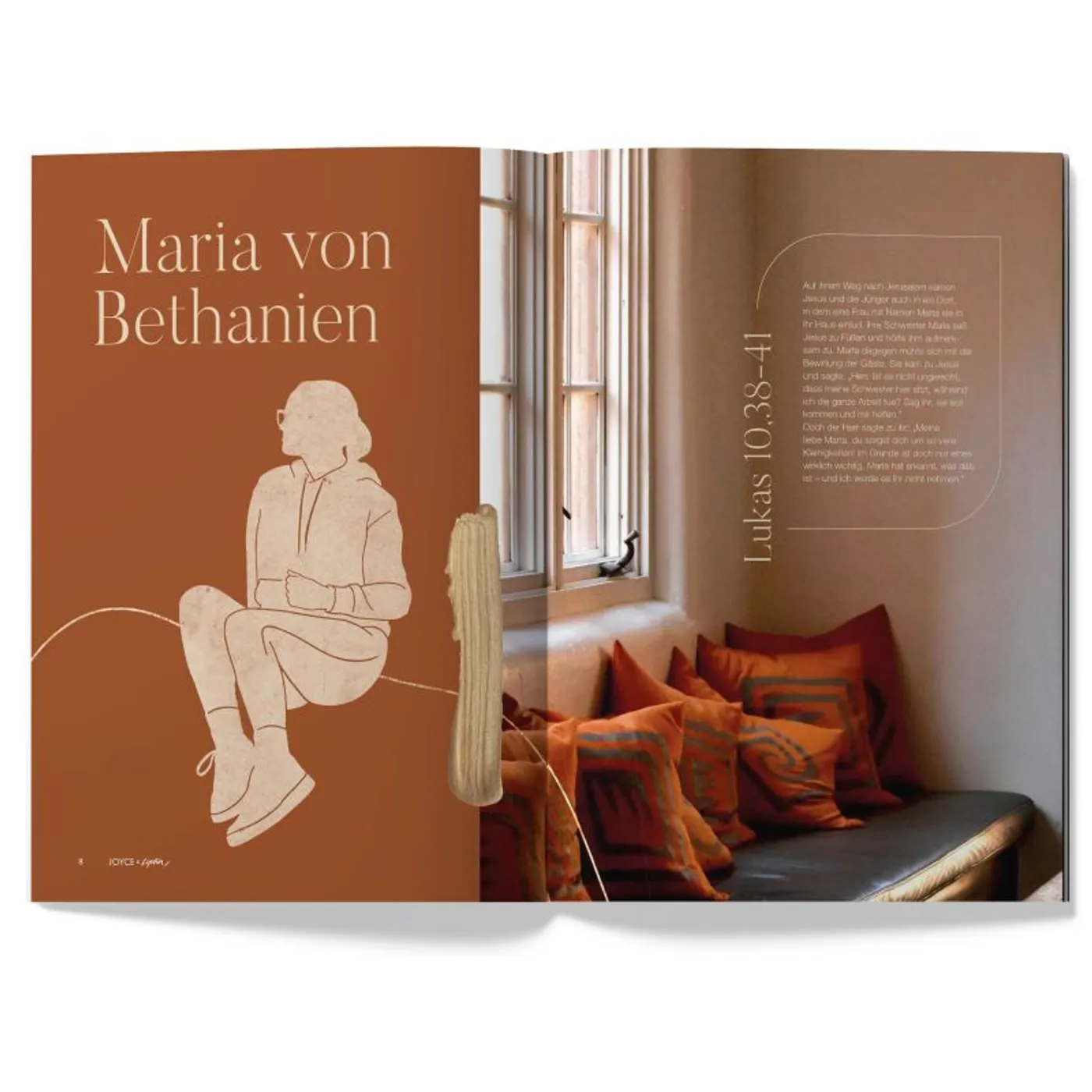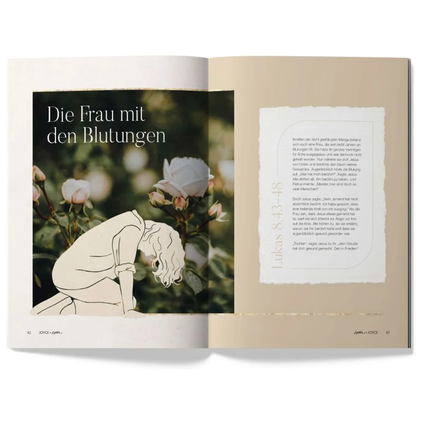 Ein tolles Heft/Buch, dass mir die biblischen Frauen in ihrer damaligen Situation und ihrer Begegnung mit Jesus näher bringen, da man sich eine Woche lang mit einer Frau z.B. Maria und Marta und einem kurzen biblischen Text auseinander setzt bzw. sich beschäftigt, Das Buch macht Mut, Gott/Jesus alle Bereiche des eigenen Lebens anzuvertrauen. Ihm neu zu vertrauen, dass er es gut mit mir meint, mich sieht und so liebt wie ich bin.