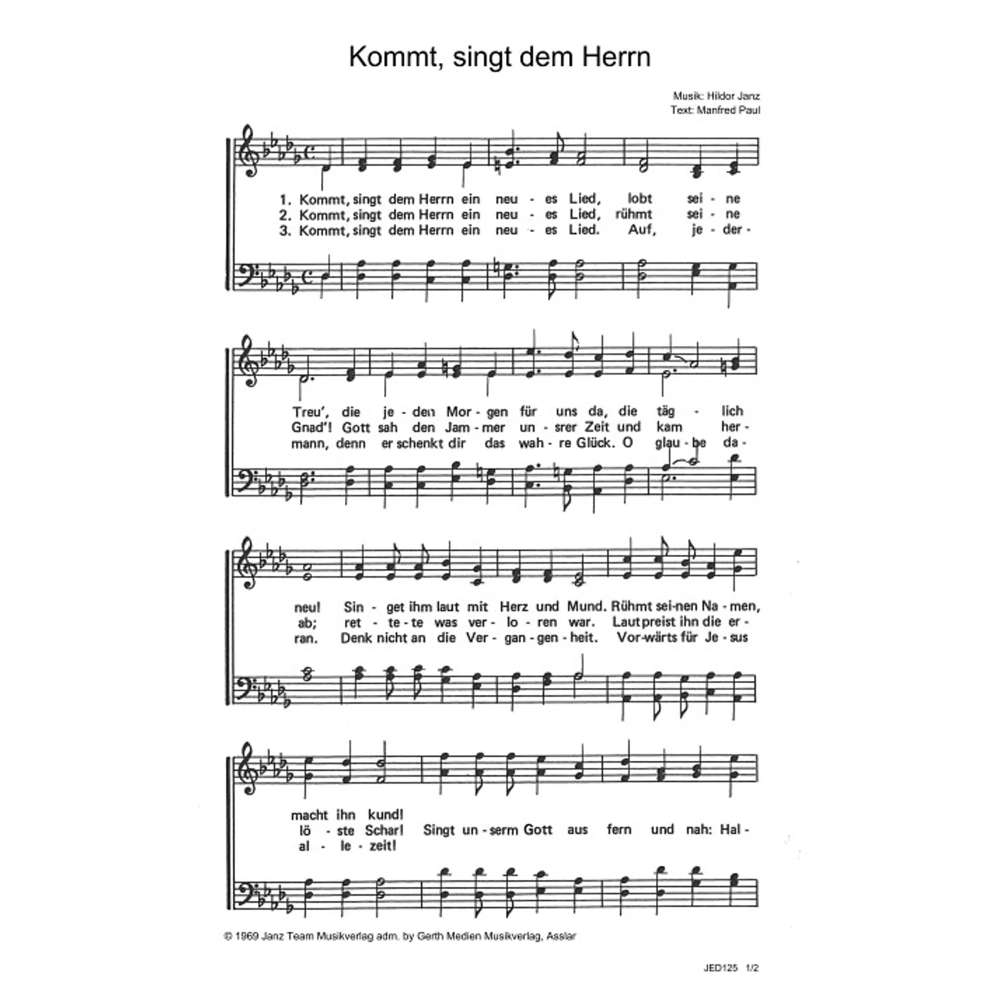 Kommt, singt dem Herrn (diese Variante haben Sie gerade ausgewählt) (traditionell, gemischter Chor, vierstimmig) Hildor Janz (Komposition), Manfred Paul (Text), DeEtta Janz (Chorsatz) |