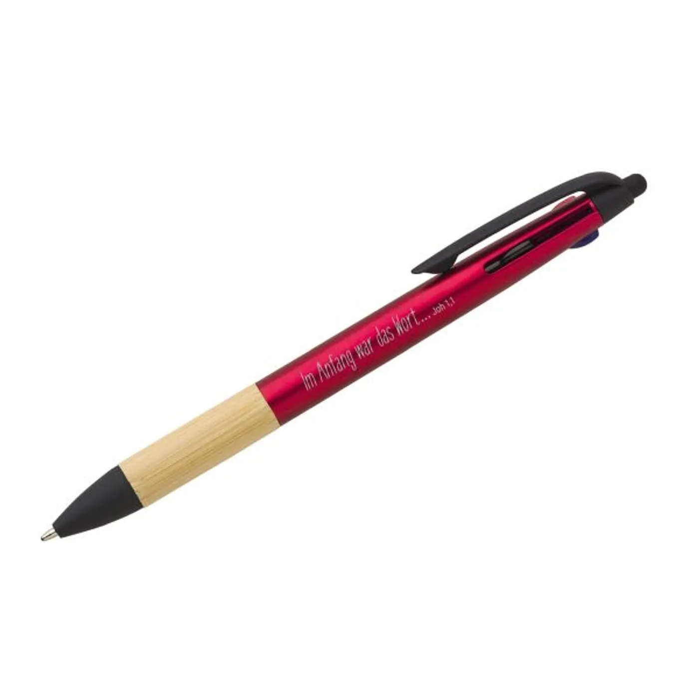 Praktischer Kugelschreiber mit 3 verschiedenen Minen und einer Griffzone aus Bambus. Passt in jedes Mäppchen. Der Kugelschreiber schreibt in Rot, Blau und Schwarz.