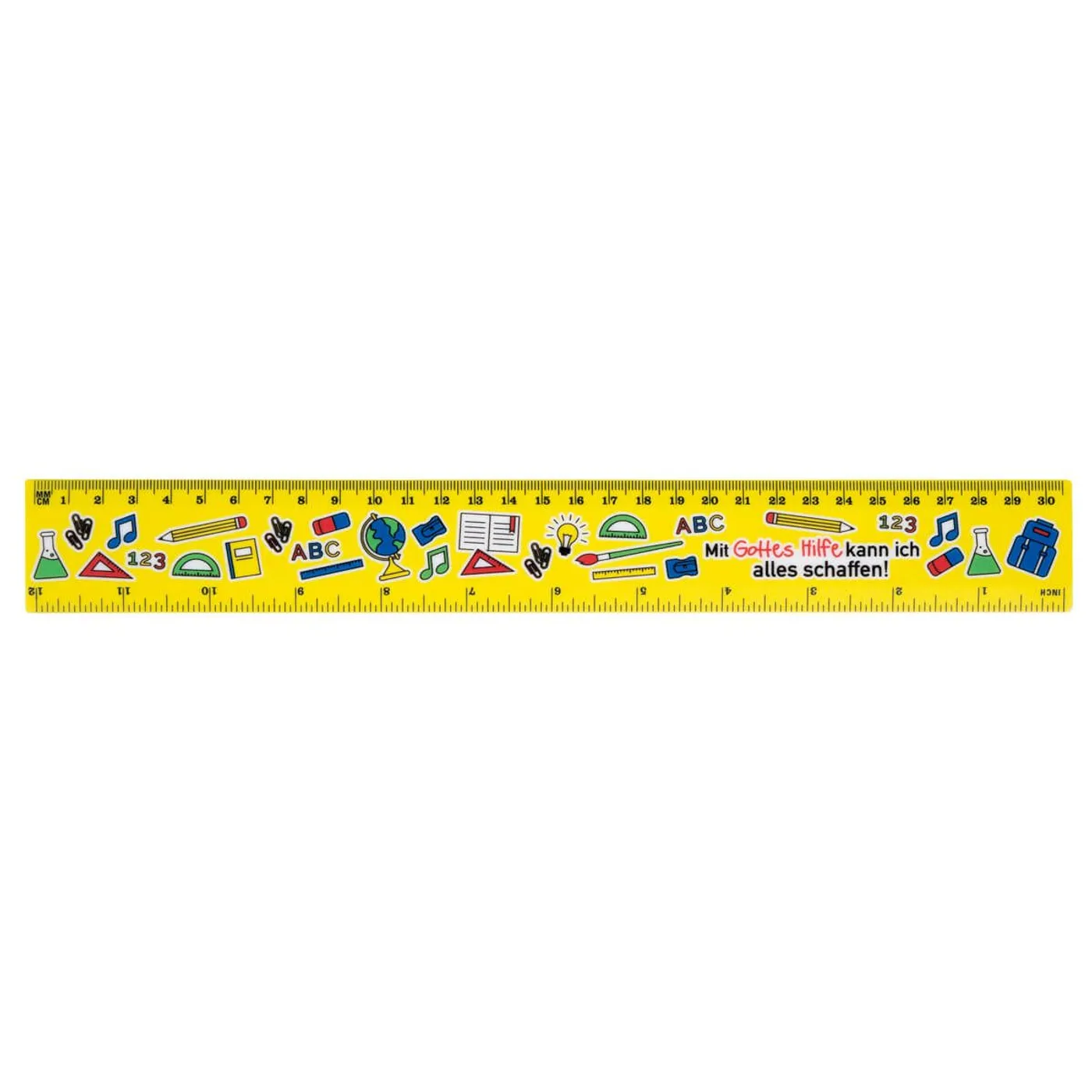 Vollflächig bedruckt ist das Lineal mit dem beliebten Motiv „Mit Gottes Hilfe kann ich alles schaffen!“ , Länge 30 cm.