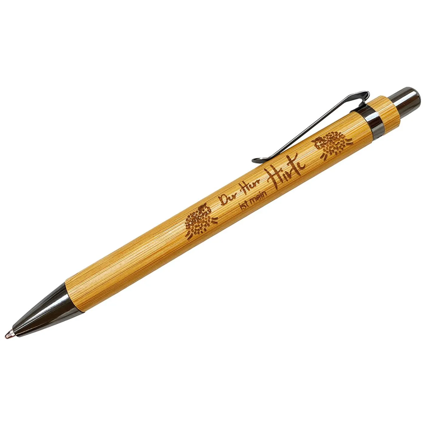 Kugelschreiber mit Korpus aus Bambus und blauschreibender Mine. Mit einer Lasergravur wird das Motiv hochwertig angebracht.