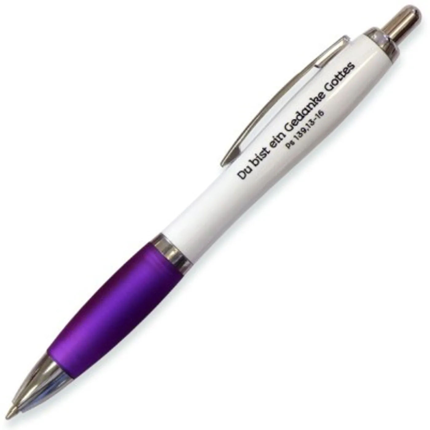 Jeden Menschen gibt es nur ein einziges Mal auf dieser Welt, denn „Du bist ein Gedanke Gottes“ (Ps 139,13-16). Ein tiefsinniger Vers auf einem Kuli in leuchtender Farbe.