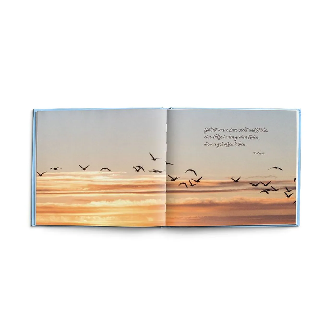 Zwischendrin eine doppelseitige Fotografie mit einem kurzen zum Buchthema passenden Bibelzitat.