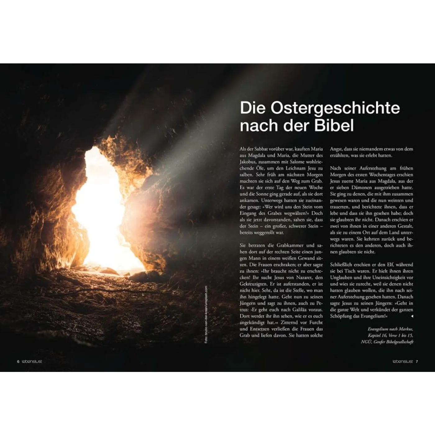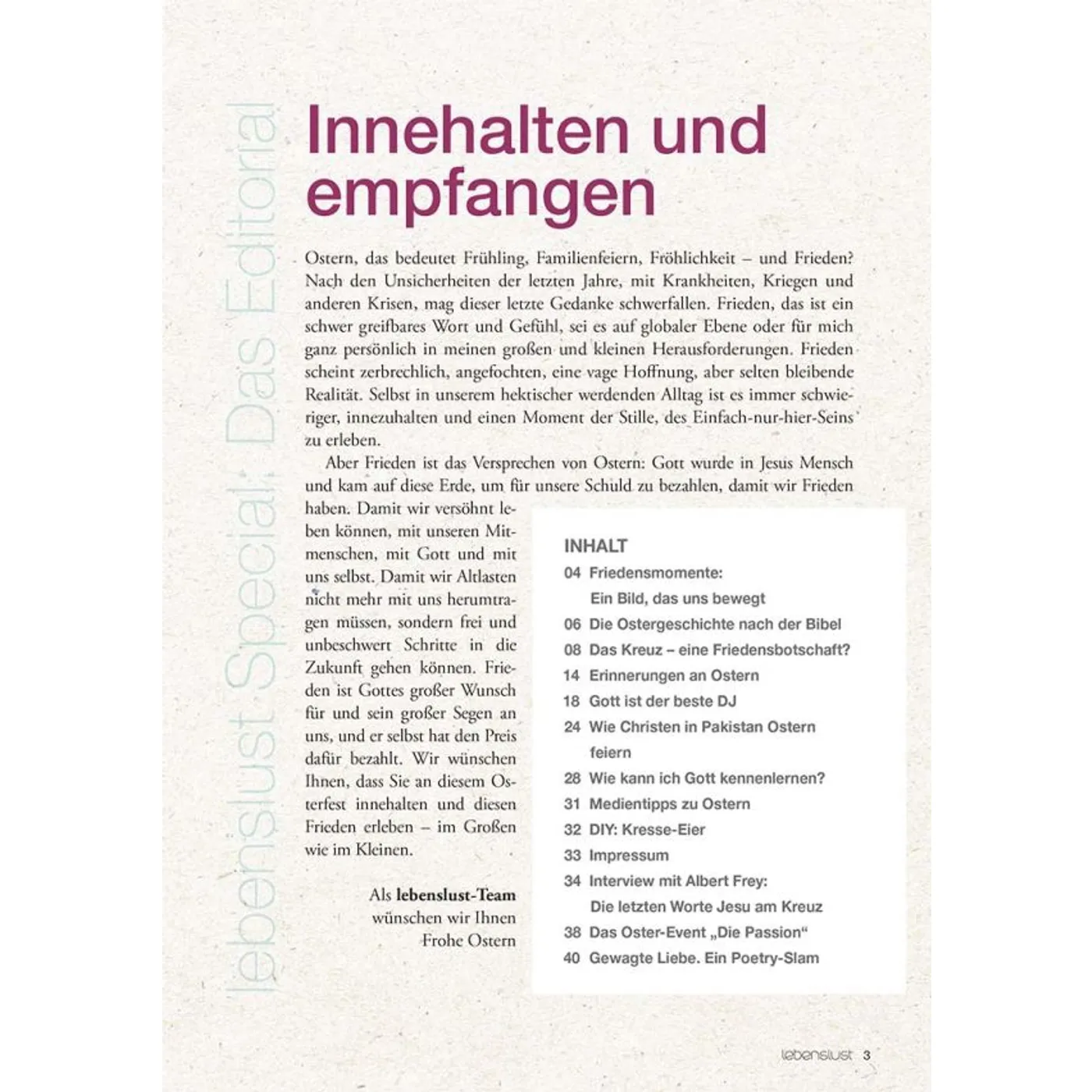 Ostern, das bedeutet Frühling, Familienfeiern, Fröhlichkeit – und Frieden? Nach den Unsicherheiten der letzten Jahre, mit Krankheiten, Kriegen und anderen Krisen, mag dieser letzte Gedanke schwerfallen. Frieden scheint zerbrechlich und angefochten. Aber Frieden ist das Versprechen von Ostern: Gott wurde in Jesus Mensch und kam auf diese Erde, um für unsere Schuld zu bezahlen, damit wir Frieden haben. Damit wir versöhnt leben können, mit unseren Mitmenschen, mit Gott und mit uns selbst. Das Osterspecial von Lebenslust berichtet in vielfältigen Beiträgen von Menschen, die sich auf die Suche nach diesem Frieden begeben haben. Die Ostergeschichte nach der Bibel und ein Blick auf die Bedeutung des Kreuzes zeigen auf, wie Ostern in unruhigen Zeiten Halt geben kann. Im Osterspecial finden Leserinnen und Leser konkrete Ideen, wie man Gott im persönlichen Gespräch kennenlernen kann. Denn Frieden ist Gottes großer Wunsch für uns. Damit wir frei und unbeschwerte Schritte in die Zukunft gehen können. Ein Einblick in das Osterfest in Pakistan, Medientipps und DIY-Ideen zu Ostern runden das Special ab. Freunde, Nachbarn oder Bekannte lassen sich mit dem 44-seitigen Heft im A5-Format unaufdringlich auf den Kern des Osterfests ansprechen. Ein kleines wertvolles Geschenk zu Ostern. Ebenso können Gemeinden das Special für Verteilaktionen nutzen oder in Karfreitags- und Ostergottesdiensten auslegen. Inhalt: • Die Ostergeschichte nach der Bibel • Das Kreuz – eine Friedensbotschaft? • Gott ist der beste DJ • Wie Christen in Pakistan Ostern feiern • Wie kann ich Gott kennenlernen? • DIY: Kresse-Eier • Interview mit Albert Frey: Die letzten Worte Jesu am Kreuz
